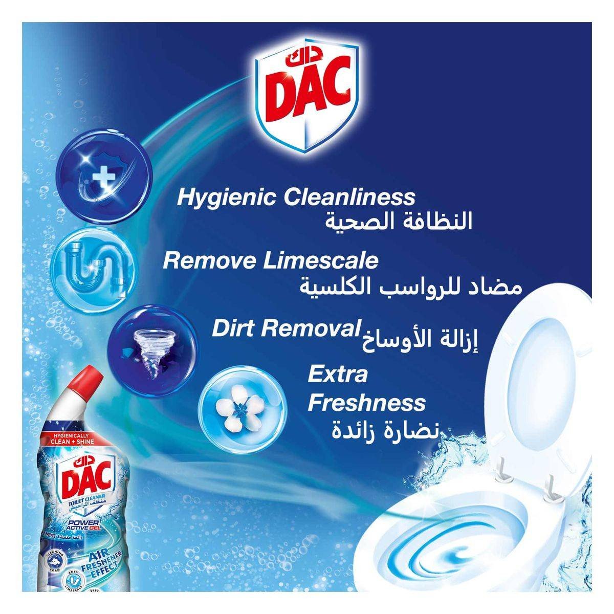 Dac Toilet Cleaner Fresh Mist is a powerful cleaning solution designed to provide hygienic cleanliness and shine. Its self-active formula ensures effortless cleaning, limescale removal, and a fresh scent without the need for scrubbing. Ideal for maintaining a sparkling toilet with minimal effort. Key Features Fresh Mist scent Self-active formula Effective in dirt removal Shiny white toilet Intensely fresh fragrance Easy-to-use toilet cleaner Eco-friendly and recyclable Hypoallergenic formula 5% Non-Ionic Surfactants, Further Ingredients, Perfumes.Dac Toilet Cleaner Fresh Mist is a powerful cleaning solution designed to provide hygienic cleanliness and shine. Its self-active formula ensures effortless cleaning, limescale removal, and a fresh scent without the need for scrubbing. Ideal for maintaining a sparkling toilet with minimal effort.Dose The Toilet Cleaner Under The Toilet Rim And Let It Activate. Leave For 30 Minutes For Heavy Deposits And Dirt. Use A Brush For Leftover Residues.Store In Dry And Cool Places.