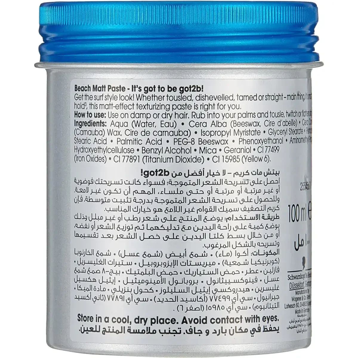 Aqua (Water, Eau), Cera Alba (Beeswax, Cire d'abeille), Cera Carnauba (Carnauba Wax, Cire de carnauba), Isopropyl Myristate, Glyceryl Stearate, Stearic Acid, Palmitic Acid, PEG-8 Beeswax, Phenoxyethanol, Aminomethyl Propanol, Hydroxyethylcellulose, Benzyl Alcohol, Mica, Geraniol, CI 77499 (Iron Oxides), CI 77891 (Titanium Dioxide), CI 15985 (Yellow 6).Schwarzkopf: Innovators in hair care, offering a range of styling products for every hair type.Use on damp or dry hair. Rub into your palms and tousle, twitch or flatten single sections as you like.Store in a cool, dry place. Avoid contact with eyes.
