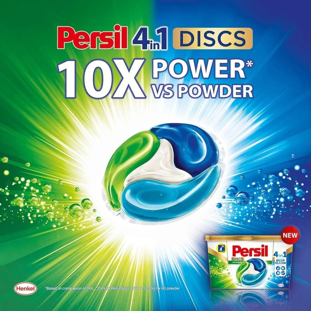 Provides Persil 4 strength tablets in just one capsule, it penetrates deep into the fibers to provide optimum hygiene. Powerful Stain Removal: Persil's unique enzyme blend combats the most stubborn stains, providing you with great cleaning results. LONG-LASTING FRESH: Persil's refined fragrance formulas deliver a pleasurable, long-lasting freshness wash after wash. Fabric Protection: Persil tablets are tough on cleaning while remaining gentle on fabrics from temperatures from 20°C to 95°C. Easy to use: Each tablet contains a pre-measured dose. No need to pour or measure, simply place the capsule in the washer drum. Key Ingredients: Water, Anionic and Non-Ionic Surfactants, Enzymes, Phosphonates, Polycarboxylates, Fragrance, Colorants (Encapsulated in a soluble PVA film).Persil is a well-known laundry detergent brand. These are concentrated all-in-one detergent capsules.Place 1 capsule directly into the drum of the washing machine before adding laundry. Do not open or pierce the capsule.DANGER: Causes serious eye damage. HARMFUL to aquatic life. Keep out of reach of children. Avoid contact with eyes and skin. Do not ingest.
