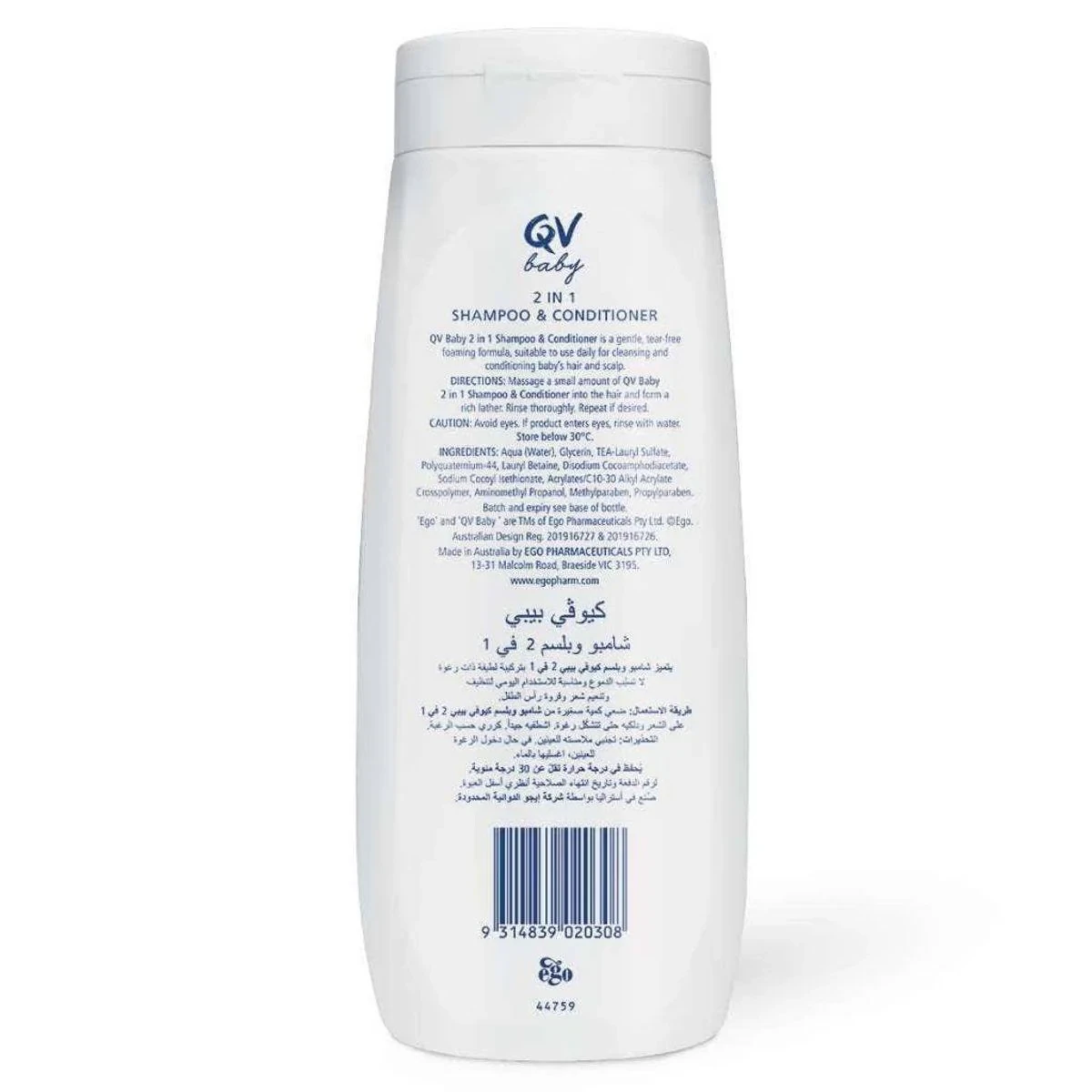 QV Baby 2 in 1 Shampoo & Conditioner is a gentle, tear-free foaming formula designed for daily use. It cleanses and conditions baby's hair and scalp, ensuring softness and comfort. Key Features Gentle tear-free formula Suitable for daily use Cleanses and conditions baby's hair and scalp Made in Australia Aqua (Water), Glycerin, TEA-Lauryl Sulfate, Polyquaternium-44, Lauryl Betaine, Disodium Cocoamphodiacetate, Sodium Cocoylisethionate, Acrylates/C10-30 Alkyl Acrylate Crosspolymer, Aminomethyl Propanol, Methylparaben, Propylparaben.Australian skincare brand known for gentle, fragrance-free products.Massage a small amount into hair and form a rich lather. Rinse thoroughly. Repeat if desired.Avoid eyes. If product enters eyes rinse with water. Store below 30°C.