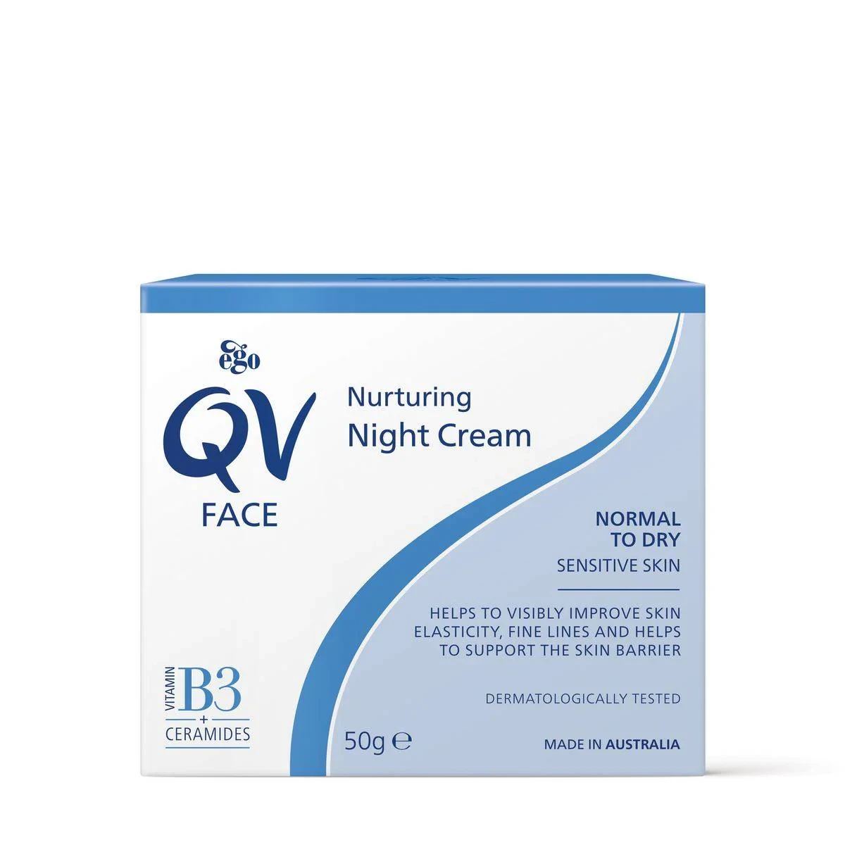 Aqua (Water), Glycerin, Cyclopentasiloxane, Carthamus Tinctorius (Safflower) Seed Oil, Paraffinum Liquidum, Petrolatum, Cetearyl Alcohol, Cyclohexasiloxane, PEG-100 Stearate, Glyceryl Stearate, Niacinamide (Vitamin B3), Dimethicone, Methylparaben, Sodium Polyacrylate, Propylparaben, Tocopherol, Dichlorobenzyl Alcohol, Citric Acid, Sodium Lauroyl Lactylate, Ceramide NP, Phytosphingosine, Ceramide AP, Cholesterol, Xanthan Gum, Carbomer, Ethylhexylglycerin, Ceramide EOP.Ego QV Face Night Cream is a nourishing night cream designed to hydrate and replenish moisture overnight. Formulated with Vitamin B3 and Ceramides, it improves skin elasticity and reduces fine lines. Suitable for sensitive skin, it is fragrance-free and dermatologically tested.Apply in the evening to face and neck after cleansing.For external use only. If irritation occurs, wash affected area and discontinue use.