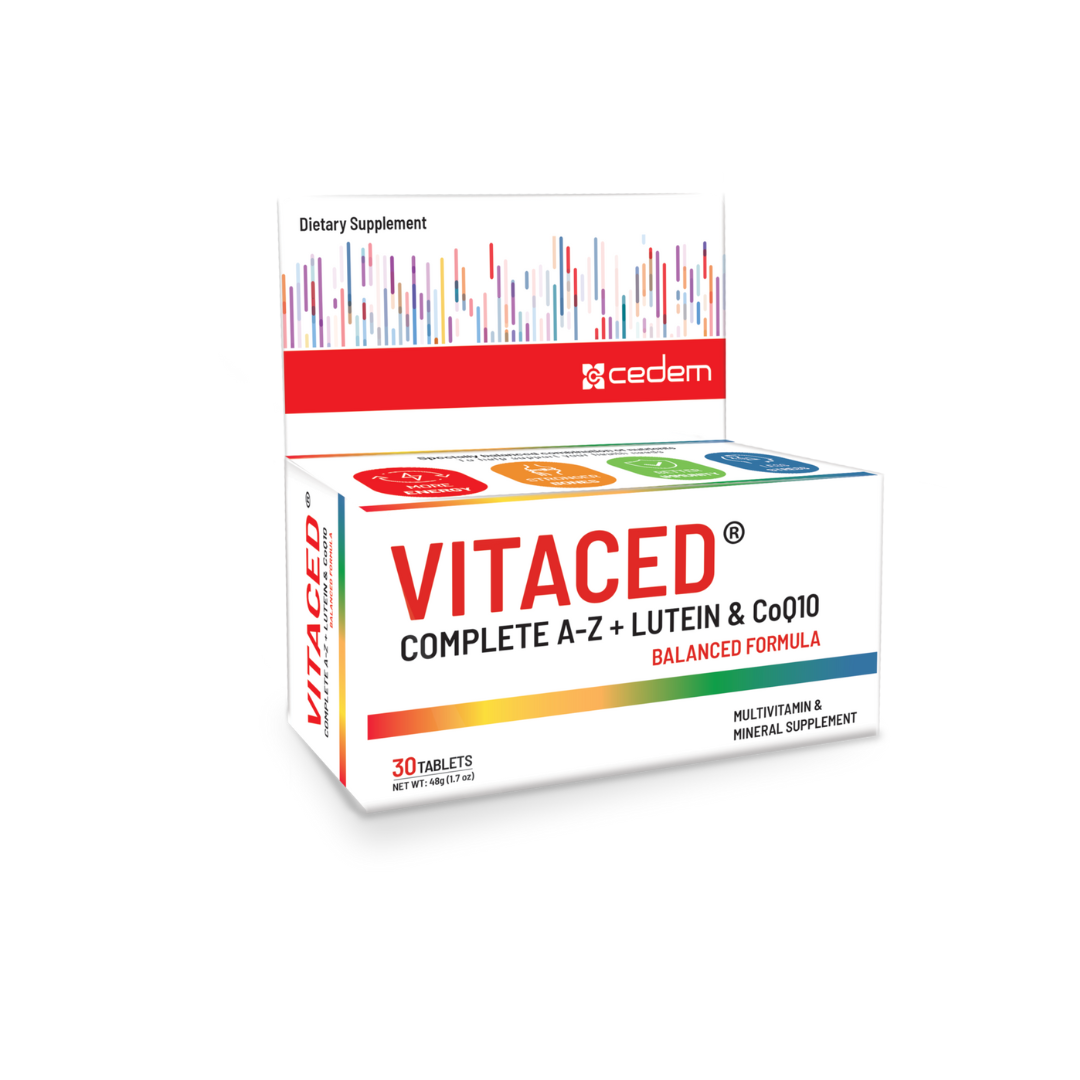 Calcium, Phosphorus, Magnesium, Potassium, Vitamin C, Niacin, Vitamin A, Folic Acid, Iodine, Vitamin K, Selenium, Chromium, Biotin, Pantothenic Acid, Molybdenum, Vitamin D3, Vitamin B1, Vitamin B2, Vitamin B6, Vitamin B12, Vitamin E, Coenzyme Q10, Lutein.Vitaced Complete A-Z Multivitamin + Lutein & Q10 is a comprehensive daily supplement. It contains 27 essential vitamins and minerals, including Lutein and CoQ10, to support energy, immunity, skin, hair, and nail health, as well as cognitive function and anti-aging benefits. Ideal for women facing daily stress, it is gluten-free and lactose-free.Take 1 Tablet Daily With Plenty Of Water, Preferably During Meals, Or As Recommended By A Healthcare Provider. Suitable For Adults And Children Over The Age Of 10.Suitable For Adults And Children Over The Age Of 10.