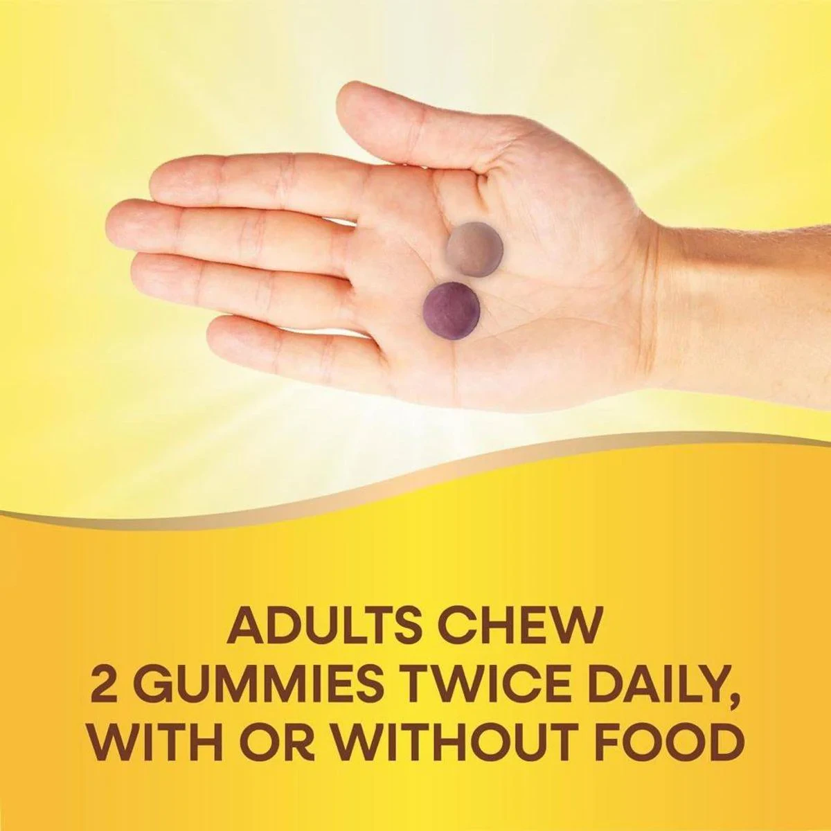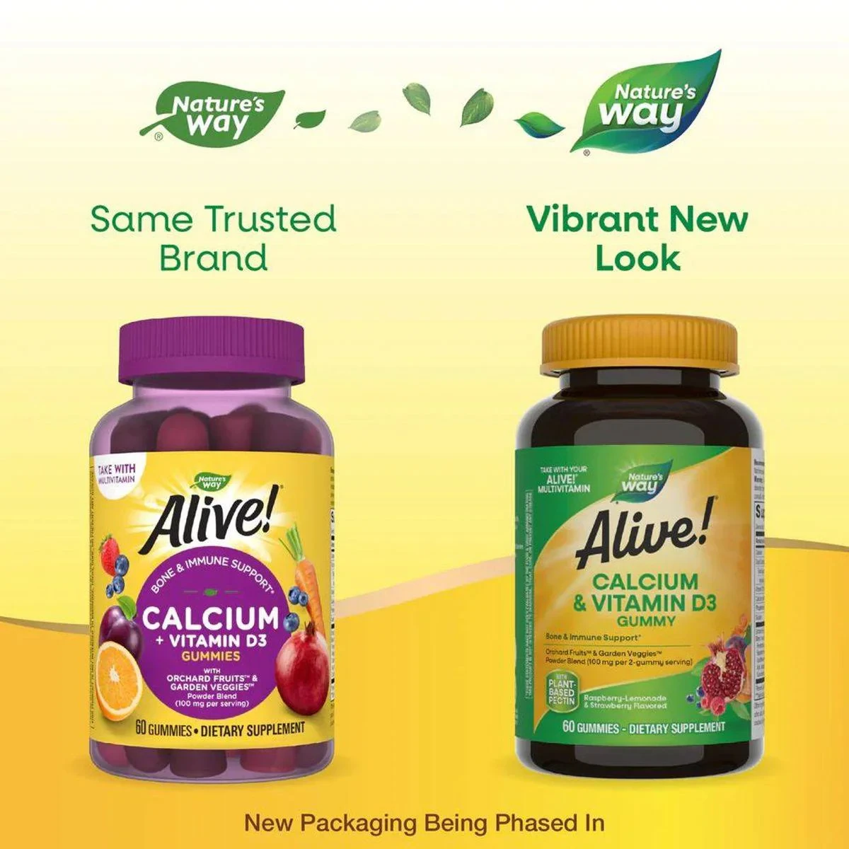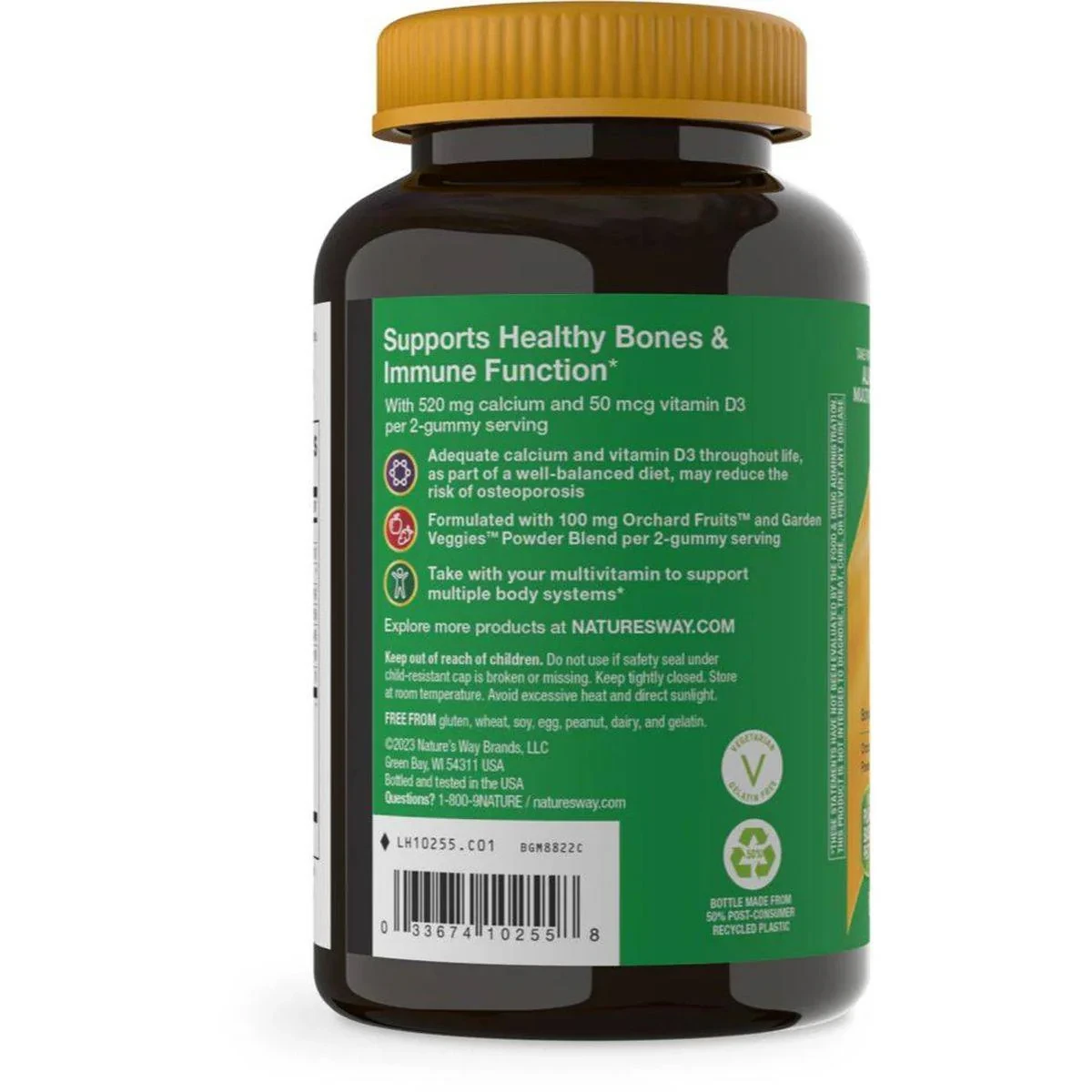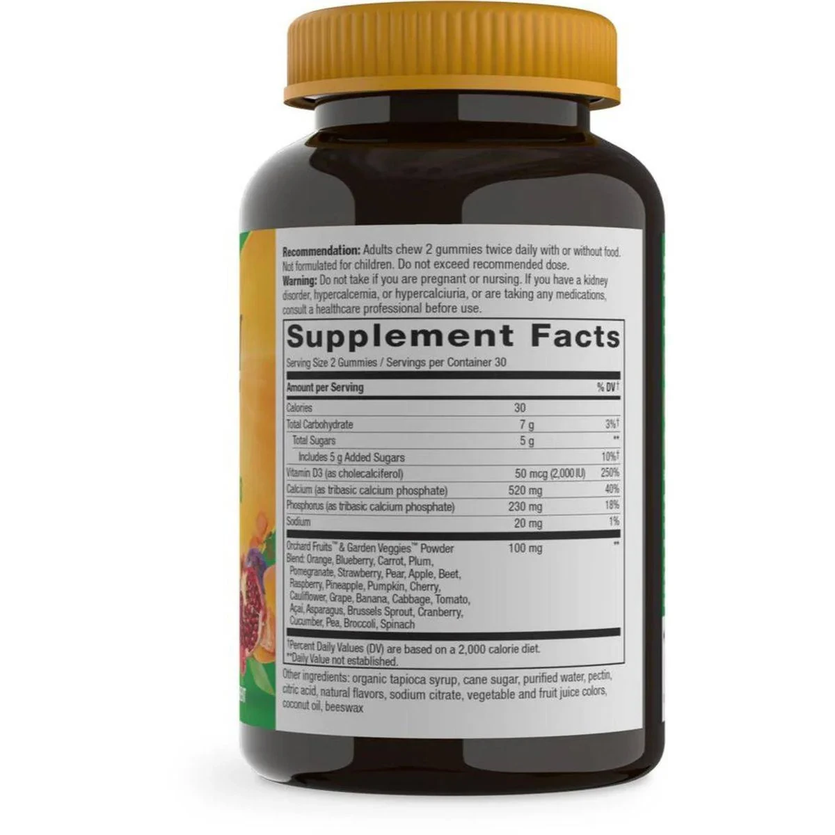 Vitamin D3 (as cholecalciferol), Calcium (as tribasic calcium phosphate), Phosphorus (as tribasic calcium phosphate), Orchard Fruits & Garden Veggies Powder Blend (Orange, Blueberry, Carrot, Plum, Pomegranate, Strawberry, Pear, Apple, Beet, Raspberry, Pineapple, Pumpkin, Cherry, Cauliflower, Grape, Banana, Cabbage, Tomato, Acai, Asparagus, Brussels Sprout, Cranberry, Cucumber, Pea, Broccoli, Spinach), Organic tapioca syrup, Cane sugar, Purified water, Pectin, Citric acid, Natural flavors, Sodium citrate, Vegetable and fruit juice colors, Coconut oil, Beeswax.Nature's Way: Pioneers in quality vitamins and supplements for over 50 years.Adults chew 2 gummies twice daily with or without food.Do not take if you are pregnant or nursing. If you have a kidney disorder, hypercalcemia, or hypercalciuria, or are taking any medications, consult a healthcare professional before use.