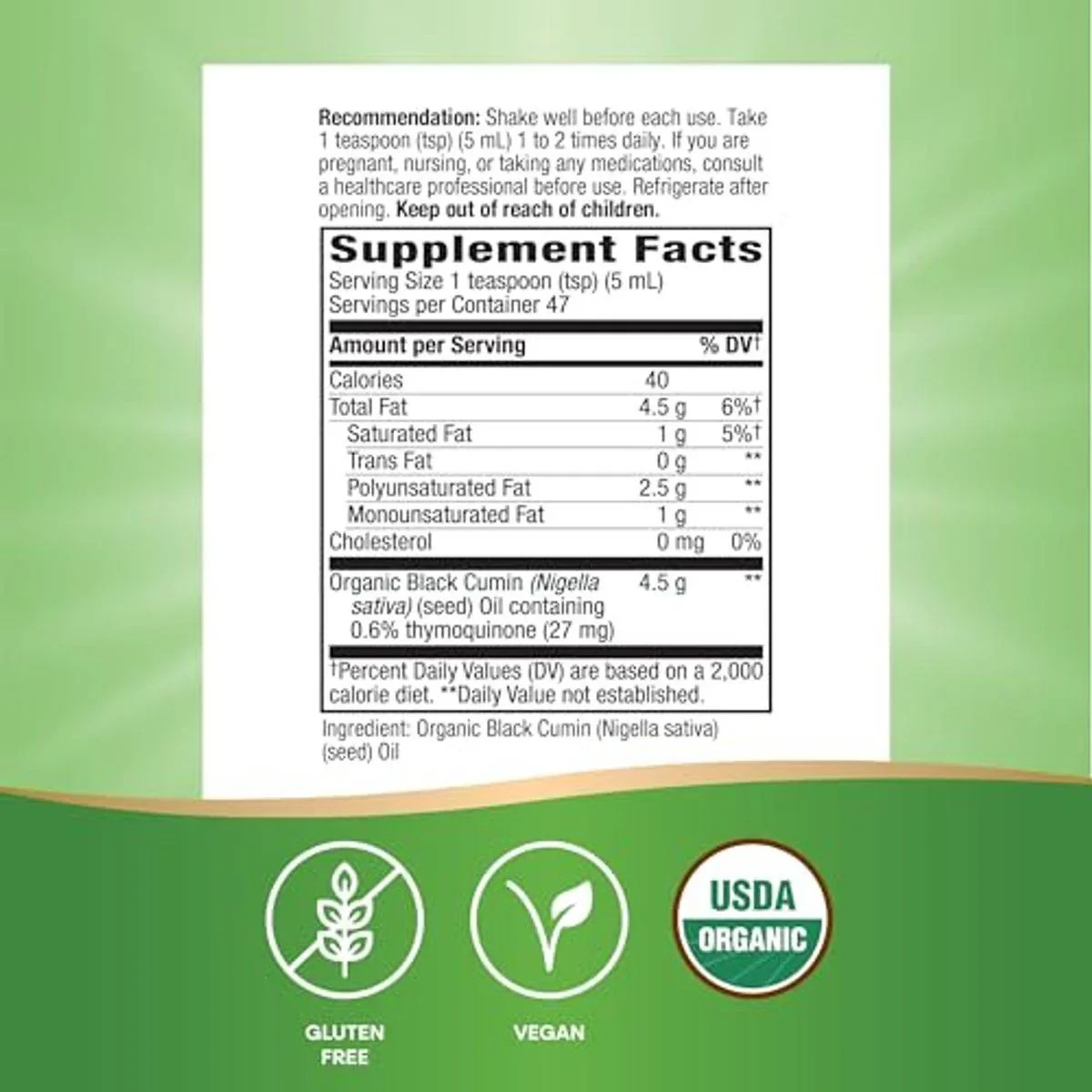 Nature's Way Organic Black Seed Oil is a cold-pressed, unrefined supplement supporting antioxidant pathways. It contains omega-6 and omega-9 fatty acids with 0.60% thymoquinone, known for its health benefits. USDA Organic certified, it's vegan, gluten-free, and free from artificial additives. Key Features Supports antioxidant pathways Cold-pressed and unrefined Unique blend of omega-6 and omega-9 Contains 0.6% thymoquinone Vegan and gluten-free No chemical solvents or filler oils Hexane-free Organic Organic Black Cumin (Nigella sativa) (seed) Oil.Nature's Way: Trusted for over 50 years in natural wellness solutions.Shake well before use. Take 1 teaspoon (5 mL) 1 to 2 times daily.If you are pregnant, nursing, or taking any medications, consult a healthcare professional before use. Keep out of reach of children.
