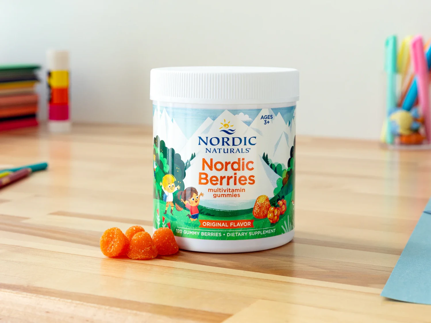 Multivitamins for children and adults.Nordic Naturals Cherry Berry 120 Gummiesorganic sugar, prebiotic fi ber (from tapioca), purifi ed water, pectin, citric acid, malic acid, sodium citrate, rice syrup solids, fruit and vegetable juice (for color), natural fl avor (in sunflower oil). No gluten, milk derivatives, No artificial colors, flavors, sweeteners, or preservativesThese tasty, chewy multivitamins provide essential vitamins and minerals for kids and adults alike. Just like our classic sweet-and-sour citrus flavor, Nordic Berries cherry berry supports growth during the early years, and health maintenance at every stage of life. It delivers the same quality you have come to expect from Nordic NatThese tasty, chewy multivitamins provide essential vitamins and minerals for kids and adults alike. Just like our classic sweet-and-sour citrus flavor, Nordic Berries cherry berry supports growth during the early years, and health maintenance at every stage of life. It delivers the same quality you have come to expect from Nordic Naturals omega-3 supplements, and makes an ideal companion to any of our premium children’s fish oil products.urals omega-3 supplements, and makes an ideal companion to any of our premium children’s fish oil products. • Chewable, pectin-based multivitamin for ages 2+ • Provides essential vitamins and minerals that growing kids need, including zinc and vitamins A, B, C, D3, and E • Delicious cherry berry flavor • No artificial coloring, flavoring, or preservatives • Ideal companion to any Nordic Naturals omega-3 product
