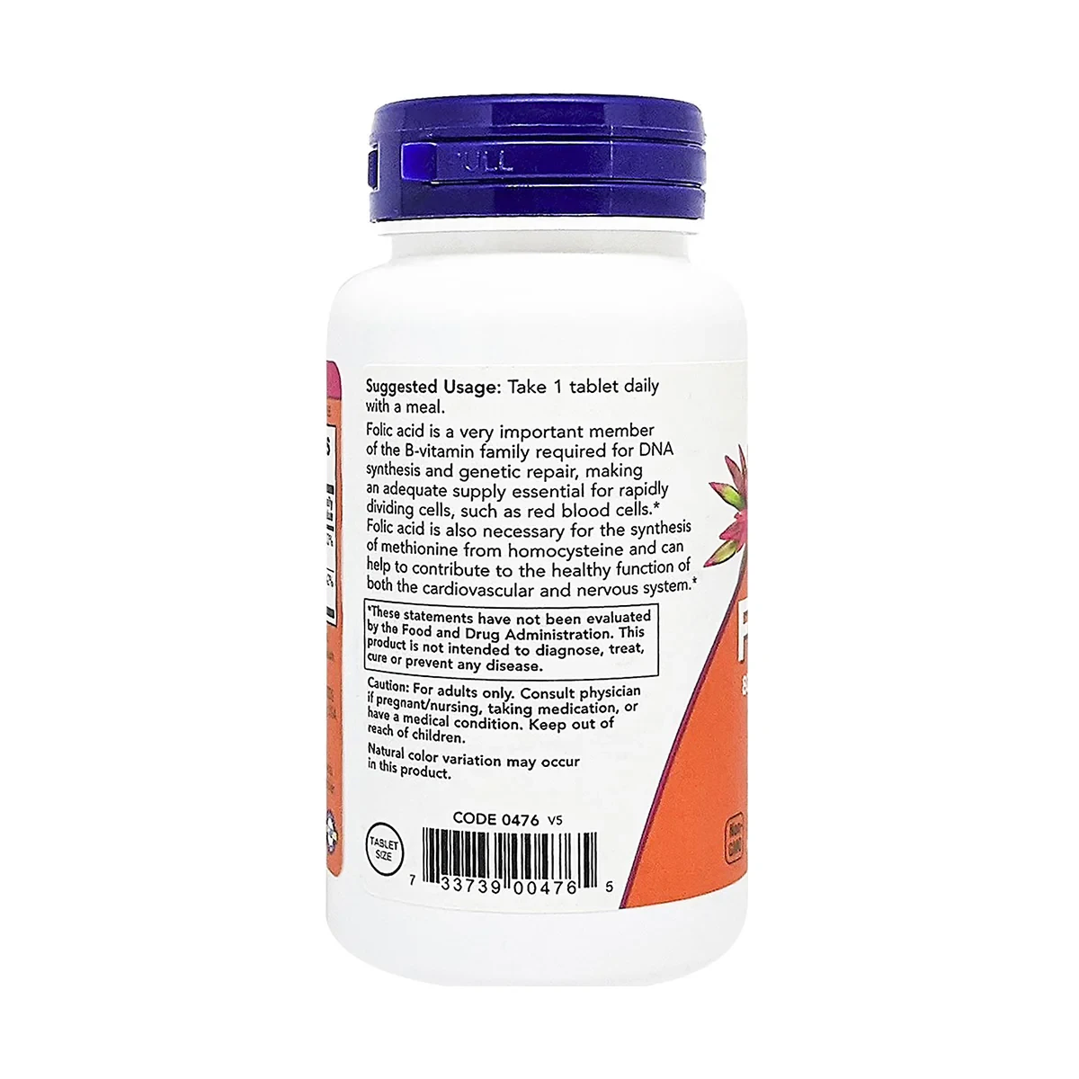 NOW's Folic Acid 800 mcg is a state of the art blend that includes 25 mcg of Vitamin B-12 for synergistic effect and quick absorption. When used in combination with vitamin B-12, folic acid may help facilitate the production of cellular energy. Folic Acid 800 mcg with Vitamin B-12 Tablets - B-Complex Vitamin Folic Acid is a very important member of the B-vitamin family required for DNA synthesis and genetic repair, making an adequate supply essential for rapidly dividing cells, such as red blood cells.* Folic Acid is also necessary for the synthesis of methionine from homocysteine and can help to contribute to the healthy function of both the cardiovascular and nervous system. Natural color variation may occur in this product. • Supports Healthy Homocysteine Metabolism. • Low sodium. • Non-GMO • Kosher certified. • Free from Wheat, Gluten, Dairy, Egg, Fish, Shellfish, Soy, and Tree nut. • Suitable for vegan and vegetarians.Folic Acid 800 mcg with Vitamin B-12 Tablets - B-Complex Vitamin Folic Acid is a very important member of the B-vitamin family required for DNA synthesis and genetic repair, making an adequate supply essential for rapidly dividing cells, such as red blood cells.* Folic Acid is also necessary for the synthesis of methionine from homocysteine and can help to contribute to the healthy function of both the cardiovascular and nervous system. Natural color variation may occur in this product. • Supports Healthy Homocysteine Metabolism. • Low sodium. • Non-GMO • Kosher certified. • Free from Wheat, Gluten, Dairy, Egg, Fish, Shellfish, Soy, and Tree nut. • Suitable for vegan and vegetarians.Folate 800 mcg (folic acid); Vitamin B-12 (as Cyanocobalamin) 25 mcg, Microcrystalline Cellulose, Stearic Acid (vegetable source) and Magnesium Stearate (vegetable source).