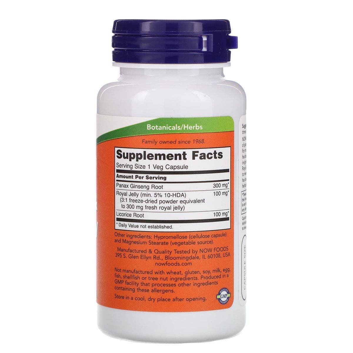 NOW Ginseng & Royal Jelly combines Panax Ginseng, Royal Jelly, and Licorice Root. Known for its invigorating and adaptogenic properties, it supports wellness and energy. Key Features Wellness Support With Licorice Root Non-GMO Gluten Free Dairy Free Egg Free Nut Free Adaptogenic Blend Panax Ginseng Root, Royal Jelly (min. 5% 10-HDA), Licorice Root, Hypromellose (cellulose capsule), Magnesium Stearate (vegetable source).Family-owned brand since 1968, known for quality dietary supplements and wellness products.Take 1 capsule 1 to 2 times daily.For adults only. Not recommended for individuals with asthma or allergies to bees, bee products, and/or pollen. Avoid using during pregnancy. Consult a physician if nursing, taking medication, or having a medical condition. Keep out of reach of children.