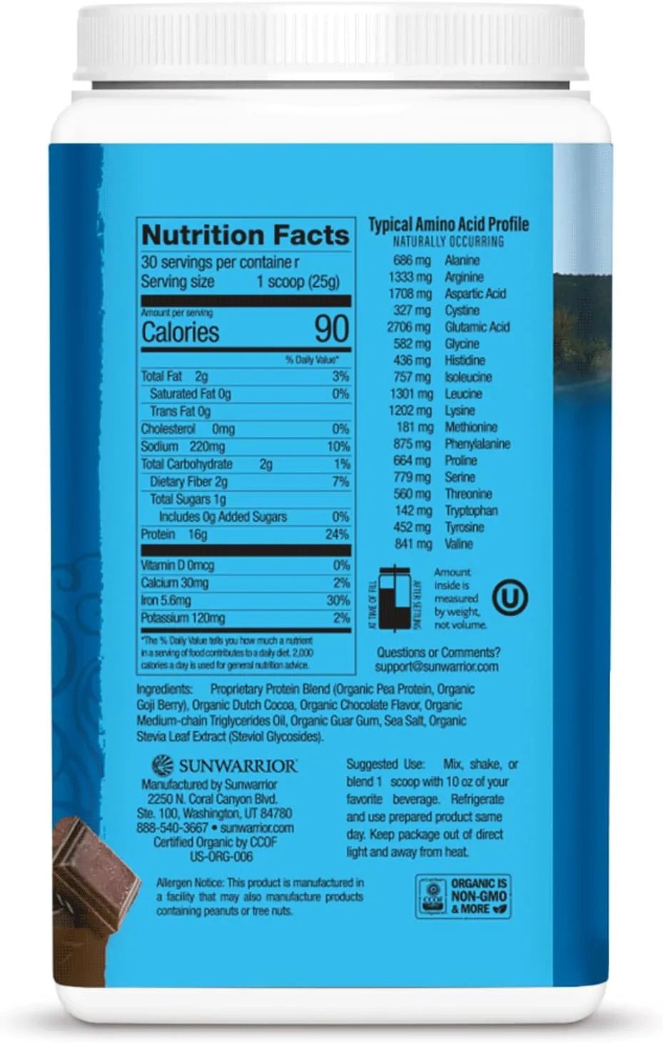 Sun Warrior Protein Warrior Blend Organic Chocolate 750gOrganic Protein Blend (Organic Pea Protein, Organic Hemp Protein, Organic Goji Berry), Organic Cocoa, Organic Guar Gum, Organic Flavor, Sweetener (Organic Steviol Glycosides).Sun Warrior is a premium brand specializing in raw, plant-based, vegan superfood proteins and supplements. They are committed to sourcing organic, non-GMO ingredients, providing complete amino acid profiles (often from blends of pea, hemp, and cranberry proteins) that are easily digestible and free from common allergens like soy and gluten.Mix 1 scoop (or recommended dosage) with 8?12 oz of water, milk alternative, or smoothie ingredients. Blend or shake until smooth and consume immediately.Consultation: Consult your physician before beginning a dietary regimen containing this product, especially if pregnant, nursing, or have a medical condition. Safety: Keep out of reach of children. Use as a supplement only.