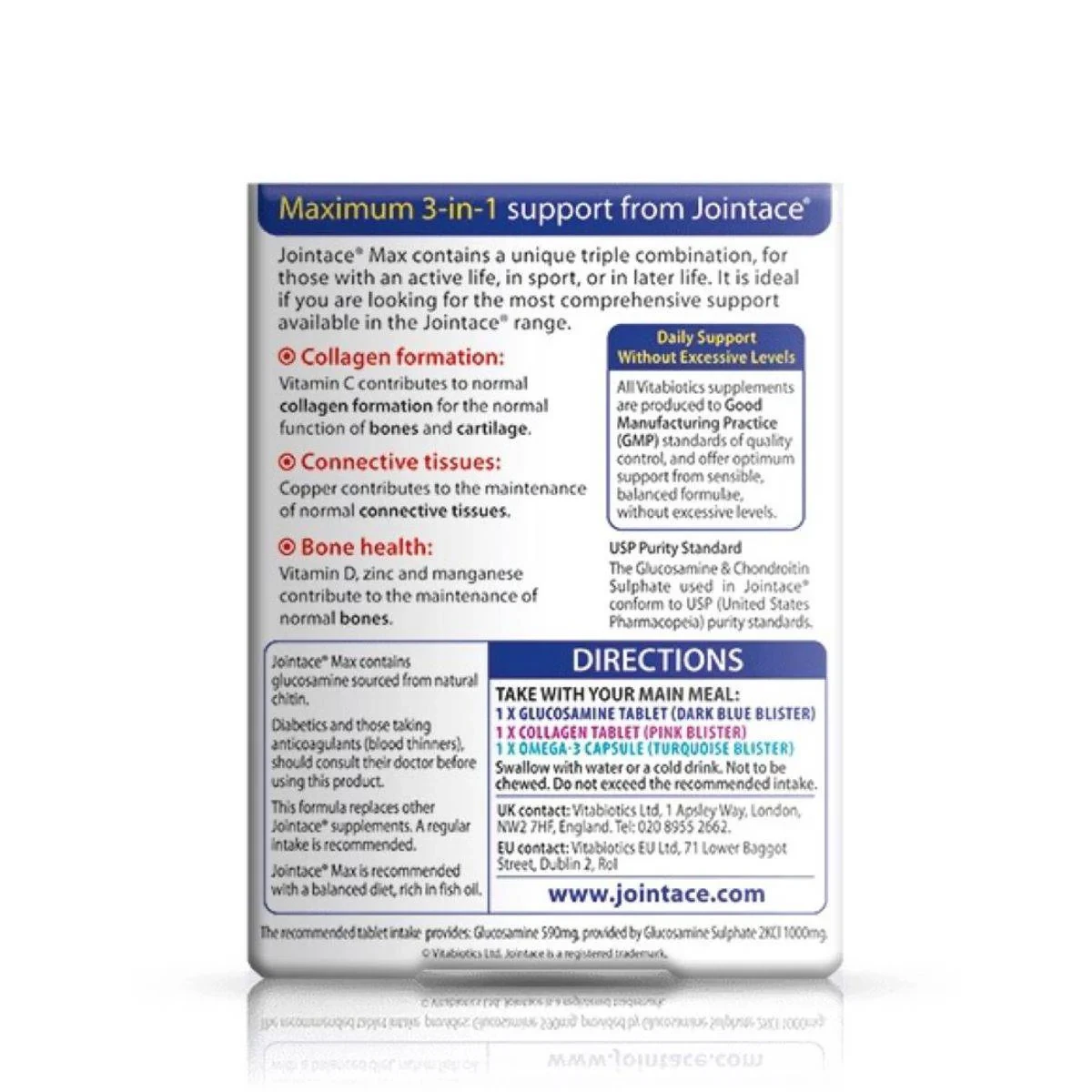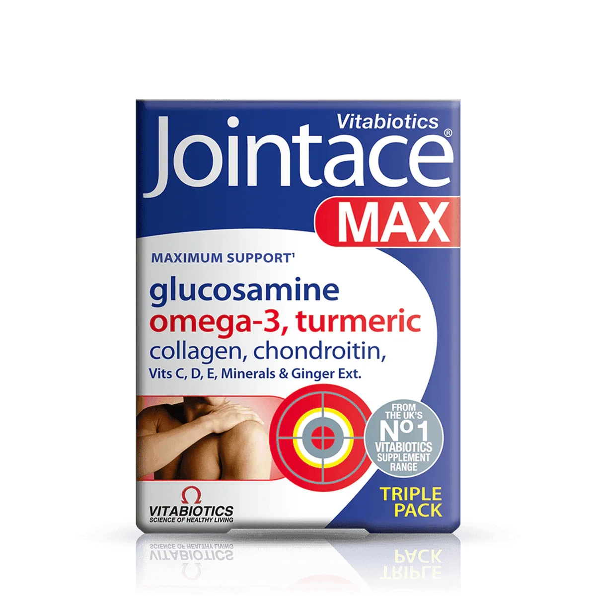 Vitabiotics Jointace Max combines essential components for joint health in a convenient triple pack, suitable for those seeking comprehensive support for active lifestyles or older age. It includes Glucosamine, Omega-3, Turmeric, Collagen, and Chondroitin, along with vitamins and minerals to support bone and cartilage health.