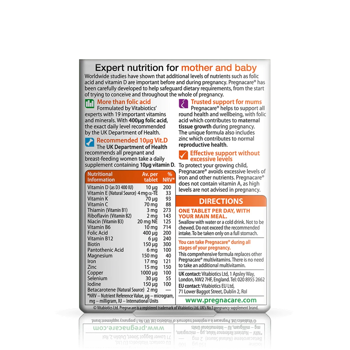 Maltodextrin, Magnesium Oxide, Microcrystalline Cellulose, Vitamin C, Ferrous Fumarate, Tablet Coating, Zinc Sulphate, Silicon Dioxide, Stearic Acid, Magnesium Stearate, Niacin, Vitamin B6, Betacarotene, Pantothenic Acid, Vitamin B12, Vitamin E, Vitamin D3, Thiamin, Riboflavin, Copper Sulphate, Vitamin K, Folic Acid, Potassium Iodide, Biotin, Sodium Selenate.Vitabiotics: Leading UK brand for pregnancy vitamins, trusted by midwives.One tablet per day with your main meal. Swallow with water or a cold drink. Not to be chewed. Do not exceed recommended intake.Store below 25°C in a dry place, out of sight and reach of children. This product contains iron, which if taken in excess, may be harmful to very young children. Those taking anticoagulants (blood thinners) should not take this product except on the advice of a doctor.