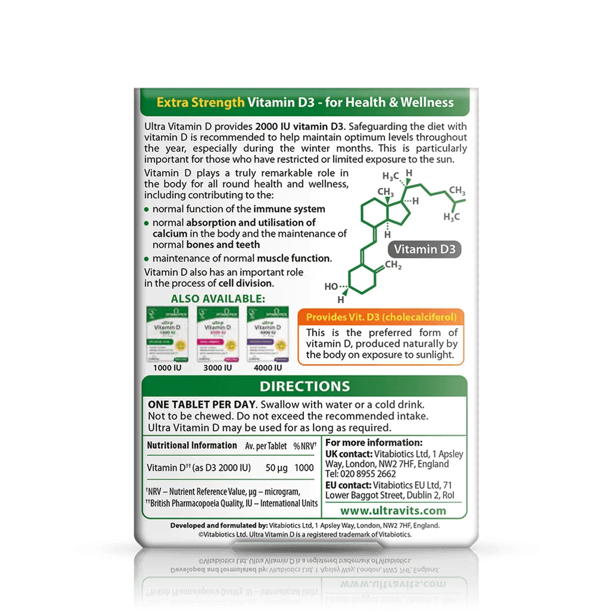 Vitabiotics Ultra Vitamin D3 2000IU tablets provide extra strength vitamin D3 to support immune function, bone and teeth maintenance, and muscle function. Ideal for those with limited sun exposure, these easy-to-swallow tablets are suitable for vegetarians and free from artificial colors and preservatives. Key Features Supports normal immune system function Contributes to normal bone and teeth maintenance Enhances muscle function Easy to swallow tablets Suitable for vegetarians Extra strength formulation Bioactive form of vitamin D3 UK's No.1 vitamin D brand Maltodextrin, Vitamin D3 (Cholecalciferol), Microcrystalline Cellulose, Tablet Coating (Hydroxypropylmethylcellulose, Isomalt, Medium Chain Triglycerides, Colour: Calcium Carbonate), Anti-Caking Agents (Silicon Dioxide, Stearic Acid, Magnesium Stearate).Vitabiotics: UK's No.1 vitamin D brand, known for science-backed health supplements.Take one tablet per day with your main meal. Swallow with water or a cold drink, do not chew.Consult your doctor or pharmacist before using if you are under medical supervision, pregnant, breast-feeding, have epilepsy, suffer from food allergies, or are allergic to any of the ingredients. Not suitable for children.