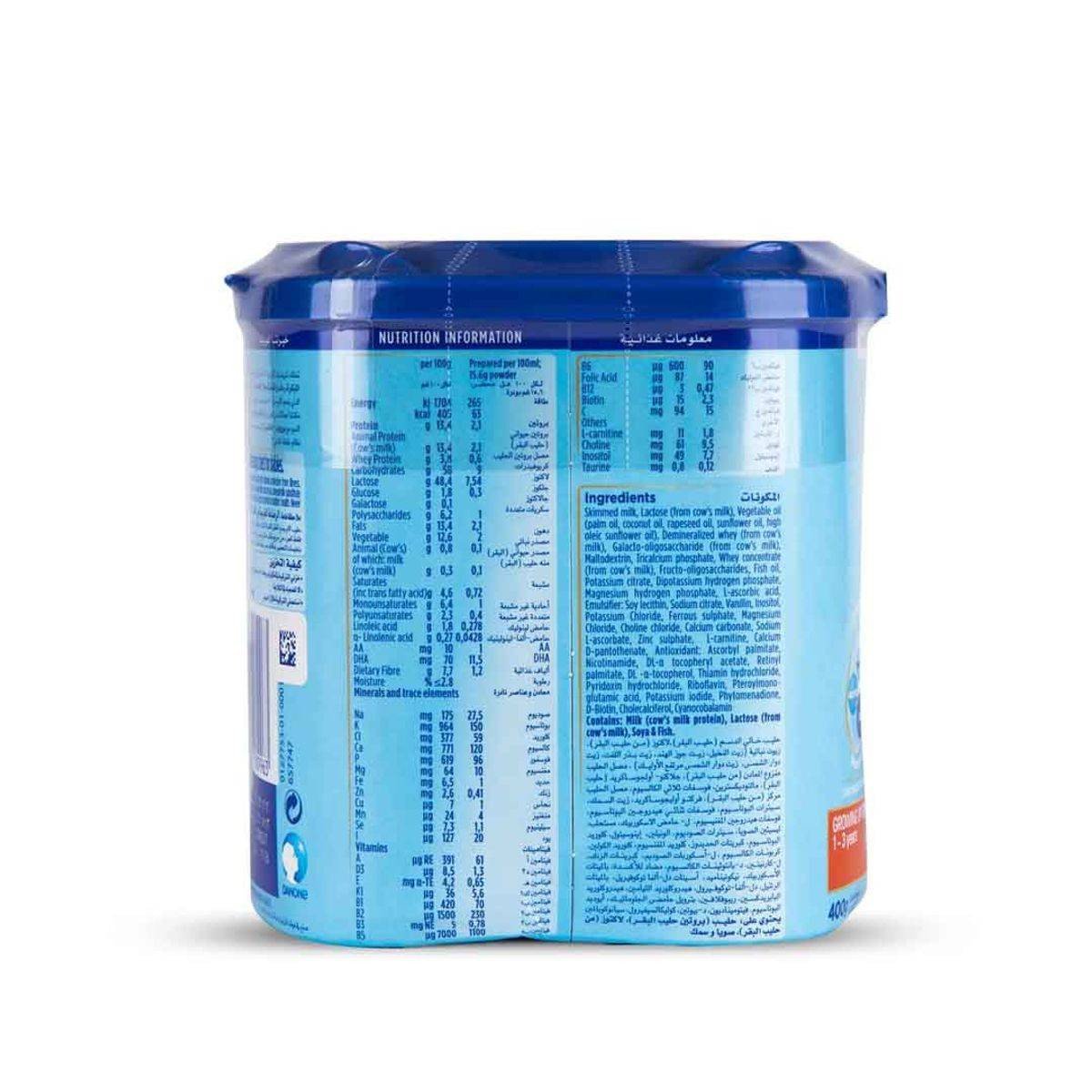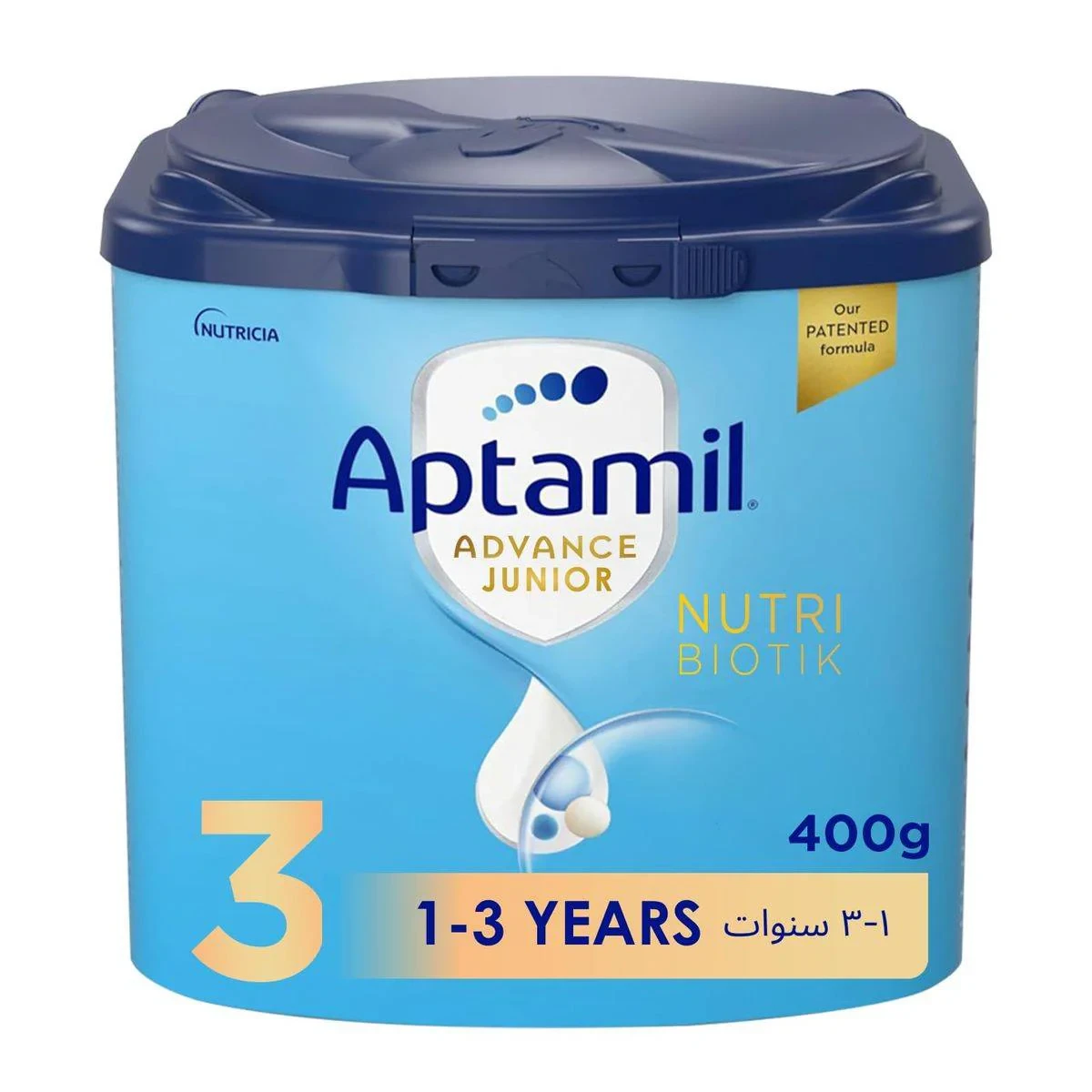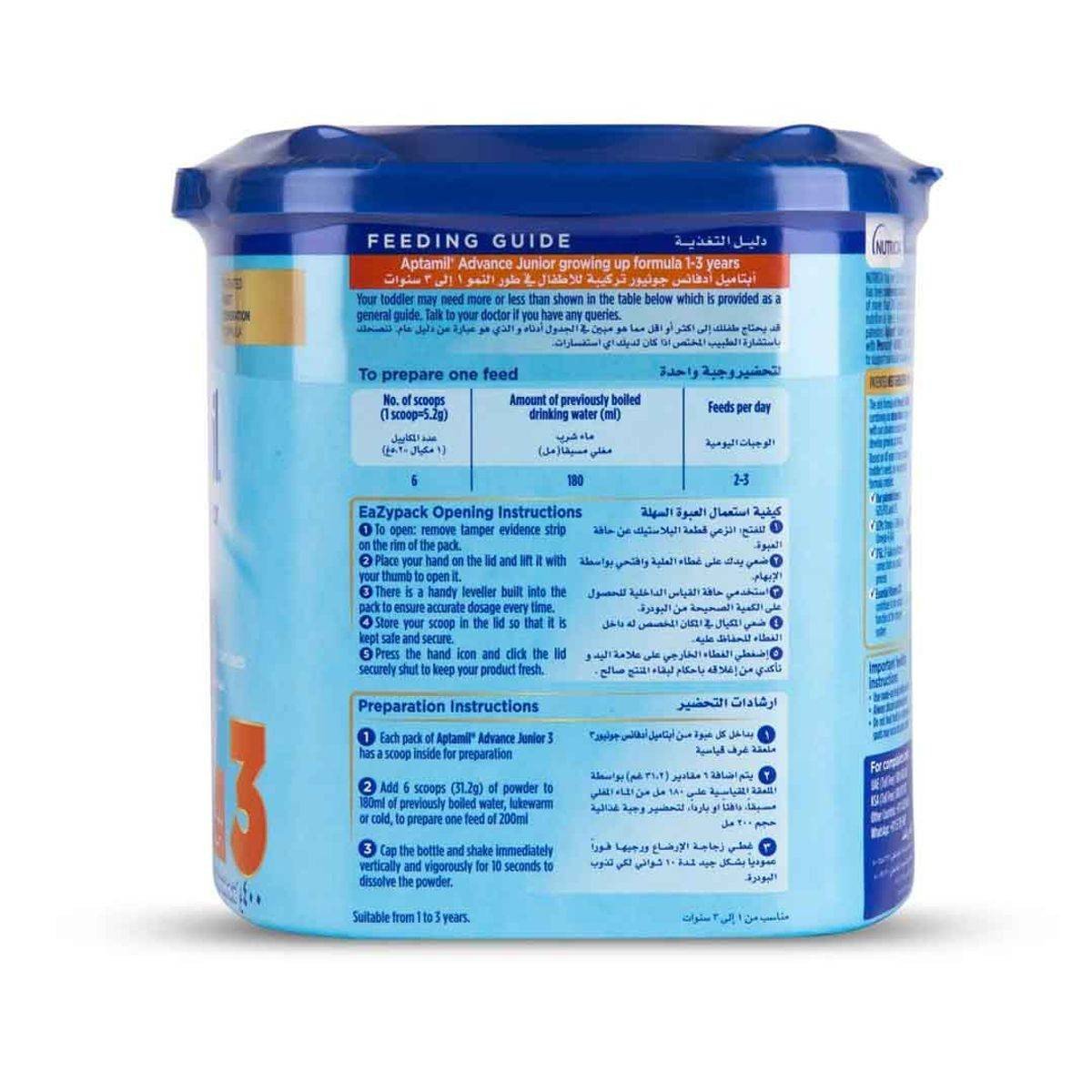 Lactose (from cow's milk), Vegetable Oils (High oleic sunflower oil, Coconut oil, Rapeseed oil, Sunflower oil), Skimmed cow's milk, Demineralized whey (from cow's milk), Galacto-oligosaccharides (from cow's milk), Whey concentrate (from cow's milk), Fructo-oligosaccharides, Tricalcium phosphate, Fish oil, Cow's Milk Protein, Potassium chloride, Potassium citrate, Magnesium hydrogen phosphate, Choline chloride, Oil from Mortierella alpina, Sodium citrate, Calcium carbonate, Emulsifier (Soy Lecithins), Sodium chloride, L-Ascorbic acid, Sodium L-ascorbate, Inositol, L-Tryptophan, Magnesium chloride, artificial flavor (Vanillin), Ferrous sulphate, Zinc sulphate, L-Carnitine, DL-alpha tocopheryl acetate, antioxidant : Ascorbyl palmitate, Calcium D-pantothenate, Nicotinamide, Copper sulphate, Thiamin hydrochloride, Retinyl palmitate, Riboflavin, Pyridoxine hydrochloride, Pteroylmonoglutamic acid, Potassium iodide, Manganese sulphate , Sodium selenite, Phytomenadione, Cholecalciferol, D-Biotin, Cyanocobalamin. Contains: Milk (cow's milk protein), Lactose (from cow's milk), Soya & Fish.Aptamil Advance Junior 3 is a scientifically advanced patented next generation formulation based on 50 years of research inspired by toddler’s needs. Our research has enabled us to develop our patented Aptamil Advance growing up formula. It is specially tailored to support your toddler’s nutritional needs from 1-3 years. The beginning of your toddler’s life is a special time. We are dedicated to researching early life nutrition & the role of immuno-nutrition for toddlers. Nutricia has over 120 years of expertise in early life nutrition and has been pioneering research for 40 years to understand your toddler’s nutritional needs.Step 1: Hygiene is Key Wash your hands thoroughly. Sterilize all feeding utensils (bottle, teat, cap, scoop) according to the manufacturer's instructions. Step 2: Prepare the Water Boil fresh, safe drinking water. Do not use water that has been boiled repeatedly. Let the boiled water cool down in the kettle for about 30 minutes to approximately 40°C. Using water that is too hot can destroy important nutrients. Measure the required amount of water into the sterilized bottle. Step 3: Measure the Powder Use only the scoop provided in the can. Level off the powder with the built-in leveler. Do not press or heap the powder into the scoop. Add the correct number of scoops to the water, as indicated on the feeding guide on the can. Adding too many or too few scoops can be harmful to your baby. Step 4: Mix the Formula Cap the bottle and shake it immediately, vigorously and vertically for about 10 seconds, until the powder is completely dissolved. Rolling the bottle or shaking in circles may not be sufficient. Step 5: Check the Temperature Before feeding, check the temperature of the formula by dropping a few drops on your wrist. It should feel lukewarm, approximately 37°C. Step 6: Feeding and Storage Feed the formula to your baby immediately. Use the prepared feed within one hour. Always discard any unfinished feed. Do not reheat in a microwave, as it can create dangerous hot spots. Store the dry powder in a cool, dry place (not in the refrigerator). Use the powder within four weeks of opening the can.Follow preparation instructions carefully to avoid harm to toddler's health. Never leave a toddler alone during feeding.