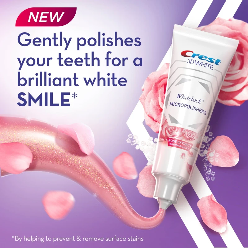 New Crest 3D White with exclusive Whitelock technology Contains 100 million micropolishers that remove 90% of surface stains and help whiten your teeth even more With Whitelock technology, you can be sure your teeth will remain whiter for longer, no matter what you consume Infused with charcoal and peppermint flavor for long-lasting coolness For a brilliant white smile, use twice a day Active: Sodium Fluoride ($sim ext{0.243%}$). Key Inactive: Glycerin, Hydrated Silica, Sodium Hexametaphosphate, Water, Flavor (Rose/Floral notes).General Info: A unique whitening toothpaste with a Rose flavor for a luxurious brushing experience. Features: Locks in whiteness. Gentle yet effective stain removal. Unique floral flavor.Adults and children 12+ years: Brush teeth thoroughly, preferably after each meal or at least twice a day. Do not swallow.