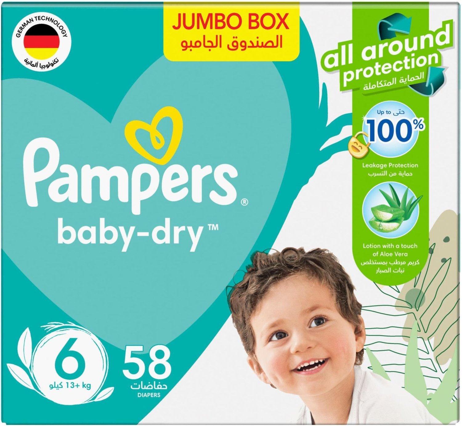 Pampers Baby Dry Diapers offer advanced leakage protection with 3x fortified layers and double leak guards. Infused with Aloe Vera lotion for rash prevention, these diapers ensure comfort and dryness for your baby. Features Double Leak Guards Aloe Vera Lotion For Rash Prevention Bigger & Wider Sides 3x Fortified Layers for Leakage Protection Comfortably Secure Taped Fit Enhanced Protection with Longer Core New Back Sheet Designs Engineered with New and Improved Diaper Technology +50% Aloe Vera LotionPampers, trusted for baby care essentials, known for innovative diaper technology and rash protection.Use As Needed For Diaper ChangesChoking Risk: Keep diapers and packaging away from baby's mouth. Discard any torn or unsealed diaper immediately.