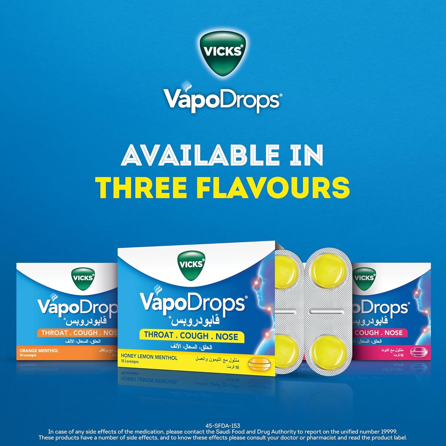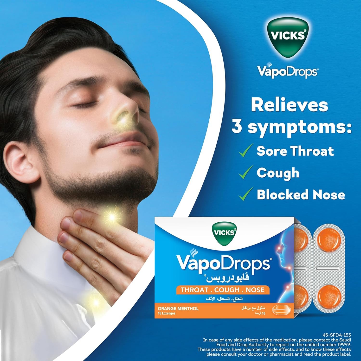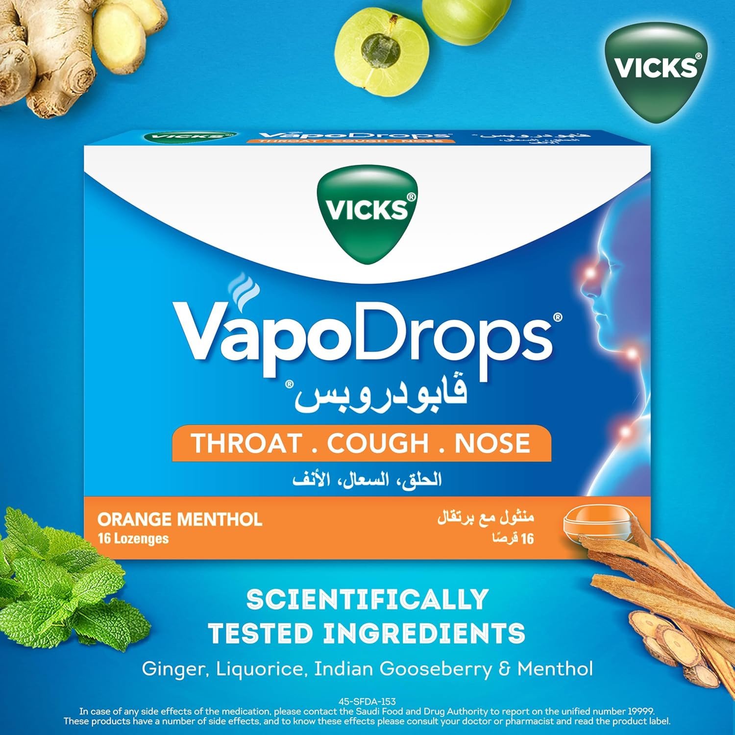 Vicks Vapo Drops Orange Lozenges are formulated to relieve cough, clear blocked nose, and soothe sore throat. Contains herbal ingredients like Liquorice, Ginger, and Indian Gooseberry. Key Features Relieves cough Clears blocked nose Soothe sore throat Contains herbal ingredients Glycyrrhiza glabra (Liquorice) 15 mg, Zingiber officinale (Ginger) 10 mg, Phyllanthus emblica (Indian gooseberry) 10 mg, Menthol 7 mg, Contains hydroxybenzoates, Contains sugars.Vicks is renowned for its effective cold and flu relief products.Adults and Children over 6 years: Dissolve 1 lozenge in your mouth every 2 hours as neededIf symptoms persist, consult your healthcare professional.