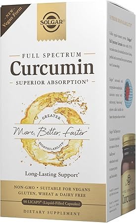 Solgar Full Spectrum Liquid Curcumin Extract offers superior absorption and bioavailability, supporting brain, joint, and immune health. Encapsulated with micelles for enhanced absorption, this non-GMO, gluten-free supplement provides 185 times better bioavailability than regular curcumin. Key Features Superior absorption Supports brain, joint & immune health Non-GMO Gluten, wheat & dairy free Suitable for vegans 185x greater bioavailability Long-lasting support Full Spectrum Curcumin Liquid Extract, Polysorbate 80, Turmeric Extract [Curcuma longa], Gelatin, Vegetable Glycerin.Solgar: Pioneers in health and wellness supplements since 1947, offering superior absorption and bioavailability.Take one (1) capsule daily, preferably with a meal.If pregnant, nursing, taking medications, or have a medical condition, consult a healthcare practitioner before use.