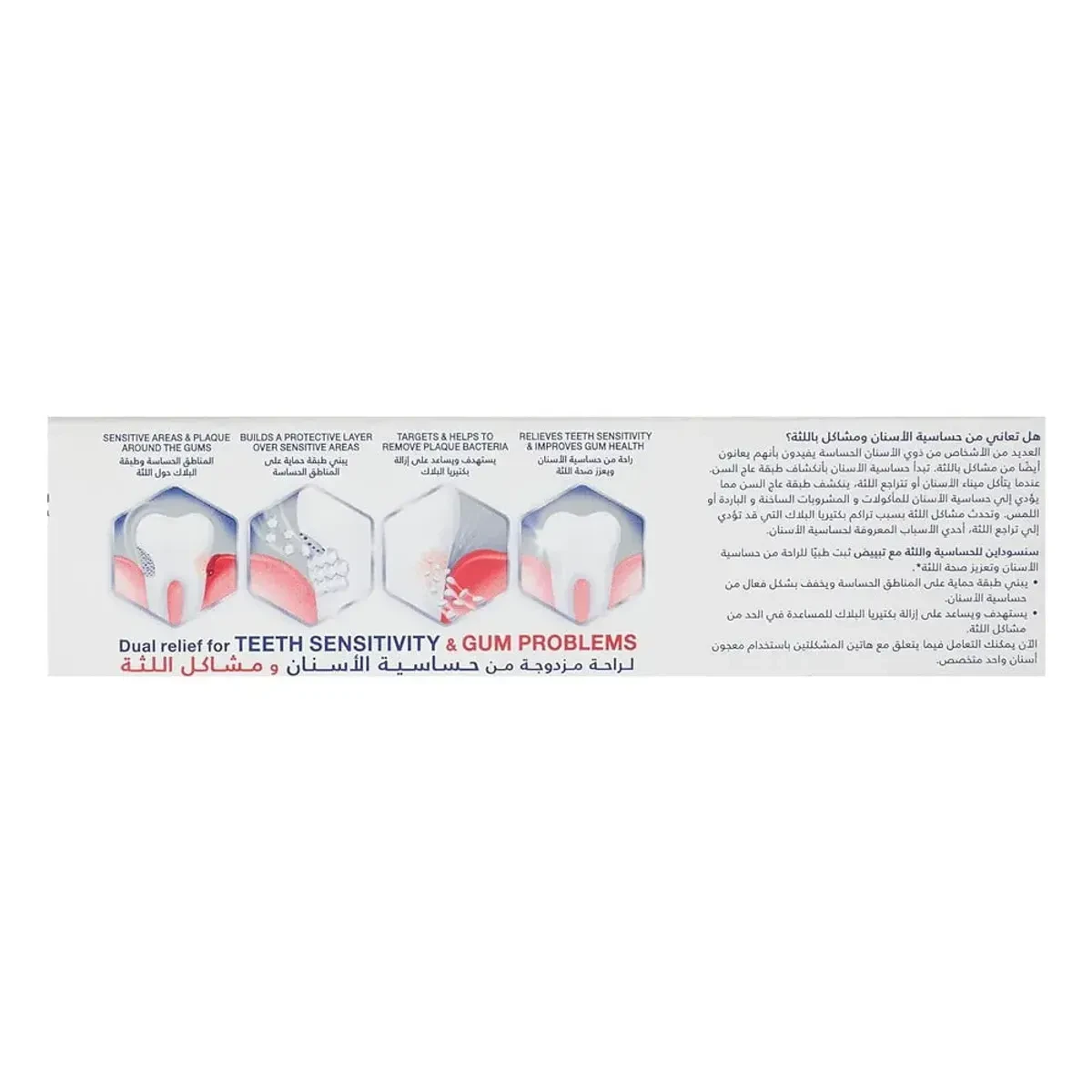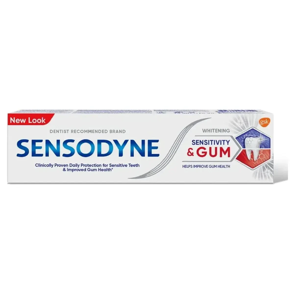 Sensodyne Sensitivity & Gum Whitening Toothpaste provides dual action relief for sensitive teeth and gum problems. It builds a protective layer over sensitive areas, targets plaque bacteria, and helps whiten teeth. Ideal for daily use, it strengthens enamel and supports gum health. Key Features Relieves tooth sensitivity Improves gum health Helps remove plaque bacteria Whitens teeth by removing surface stains Fluoride-enriched for cavity protection Clinically proven formula Suitable for daily use Stannous Fluoride 0.454% (0.15% w/v fluoride ion), Glycerin, PEG-8, Hydrated Silica, Sodium Lauryl Sulfate, Cocamidopropyl Betaine, Flavour, Pentasodium Triphosphate, Polyacrylic Acid, Sodium Saccharin, Titanium Dioxide.Sensodyne: Trusted for sensitive teeth and gum health.Brush thoroughly for at least 1 minute twice daily. Do not swallow.Not for use by children under 12 unless advised by a dentist or doctor. Sensitive teeth and gum problems may indicate an underlying issue requiring prompt care. Consult a dentist if symptoms persist or worsen.
