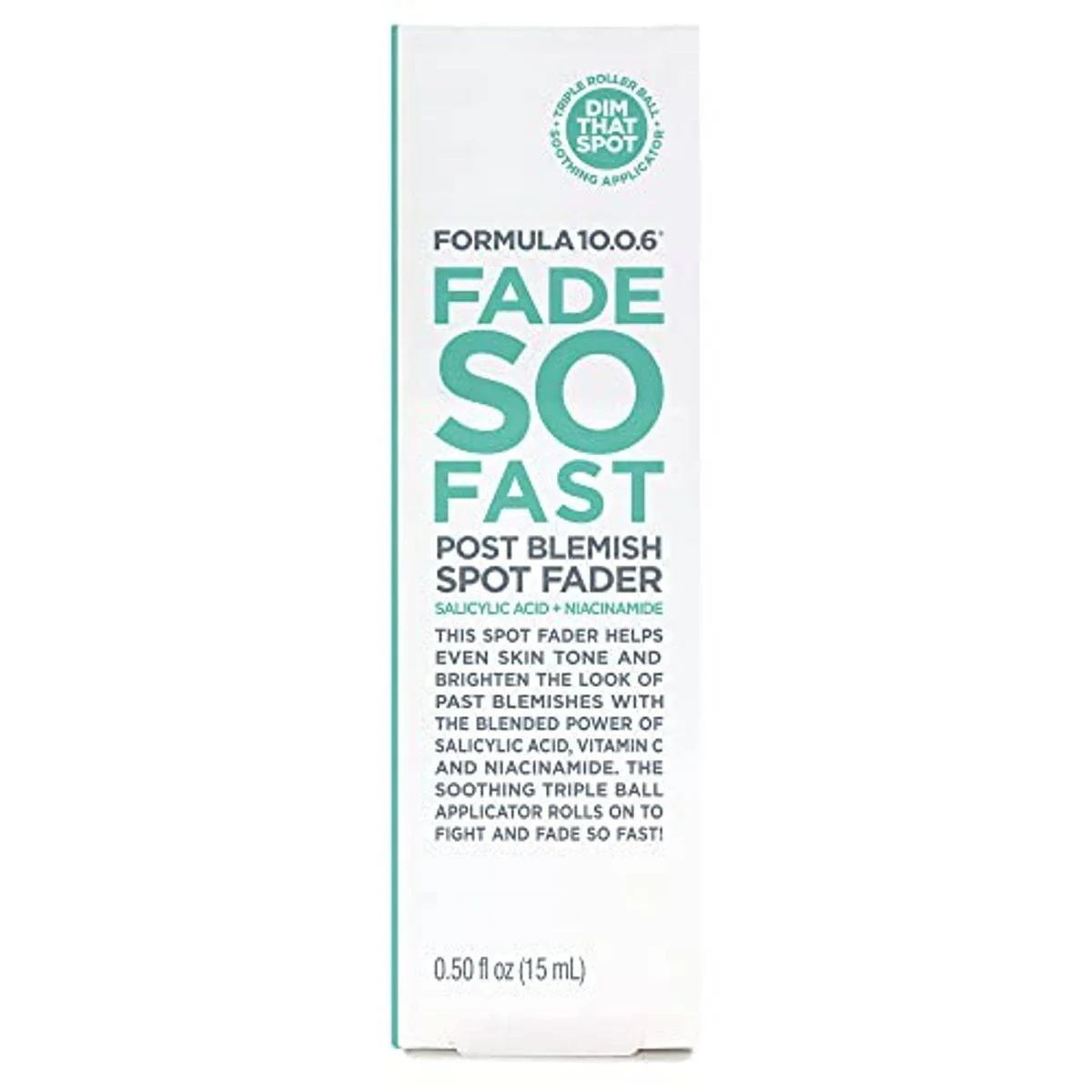 Formula 10.0.6 Fade So Fast Post Blemish Spot Fader is designed to target and fade blemishes quickly. Enriched with salicylic acid, vitamin C, and niacinamide, it helps even skin tone and brighten past blemishes. The soothing triple ball applicator ensures easy application and fast results. Ideal for those seeking clear and radiant skin. Key Features Evens skin tone Brightens past blemishes Contains Salicylic Acid Contains Vitamin C Contains Niacinamide Triple ball applicator Niacinamide, Vitamin C, Licorice Root Extract.Targeted treatment to reduce the appearance of post-acne marks and dark spots.Apply a small dab directly onto the mark. Use morning and night.