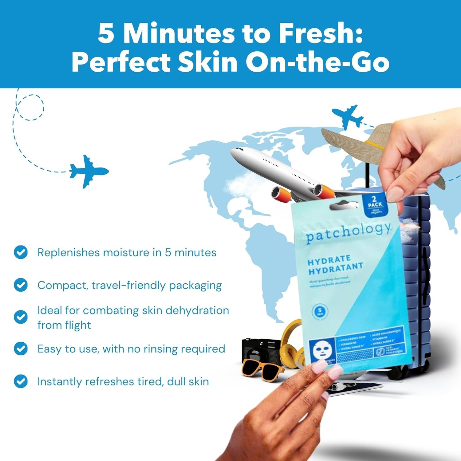 This sheet mask hydrates and rejuvenates skin in just 5 minutes. Infused with hyaluronic acid, vitamin B5, and betaine, it combats dehydration and refreshes tired skin. Ideal for travel, it provides instant visible results without rinsing. Features Replenishes moisture in 5 minutes Compact, travel-friendly packaging Ideal for combating skin dehydration from flight Easy to use, with no rinsing required Instantly refreshes tired, dull skin Hyaluronic Acid hydrates & fights aging Vitamin B5 moisturizes, heals, & soothes Betaine smooths & softens Hyaluronic Acid, Vitamin B5, BetainePatchology: Innovative skincare solutions for hydration and rejuvenation.Gently Clean Your Face And Remove A Sheet Mask From Sachet. Place A Sheet Mask On Your Face. After 10 Minutes (Or More If Desired), Remove Sheet Mask And Massage Remaining Serum Into Skin.For external use only. Avoid contact with eyes. Discontinue use if irritation occurs.