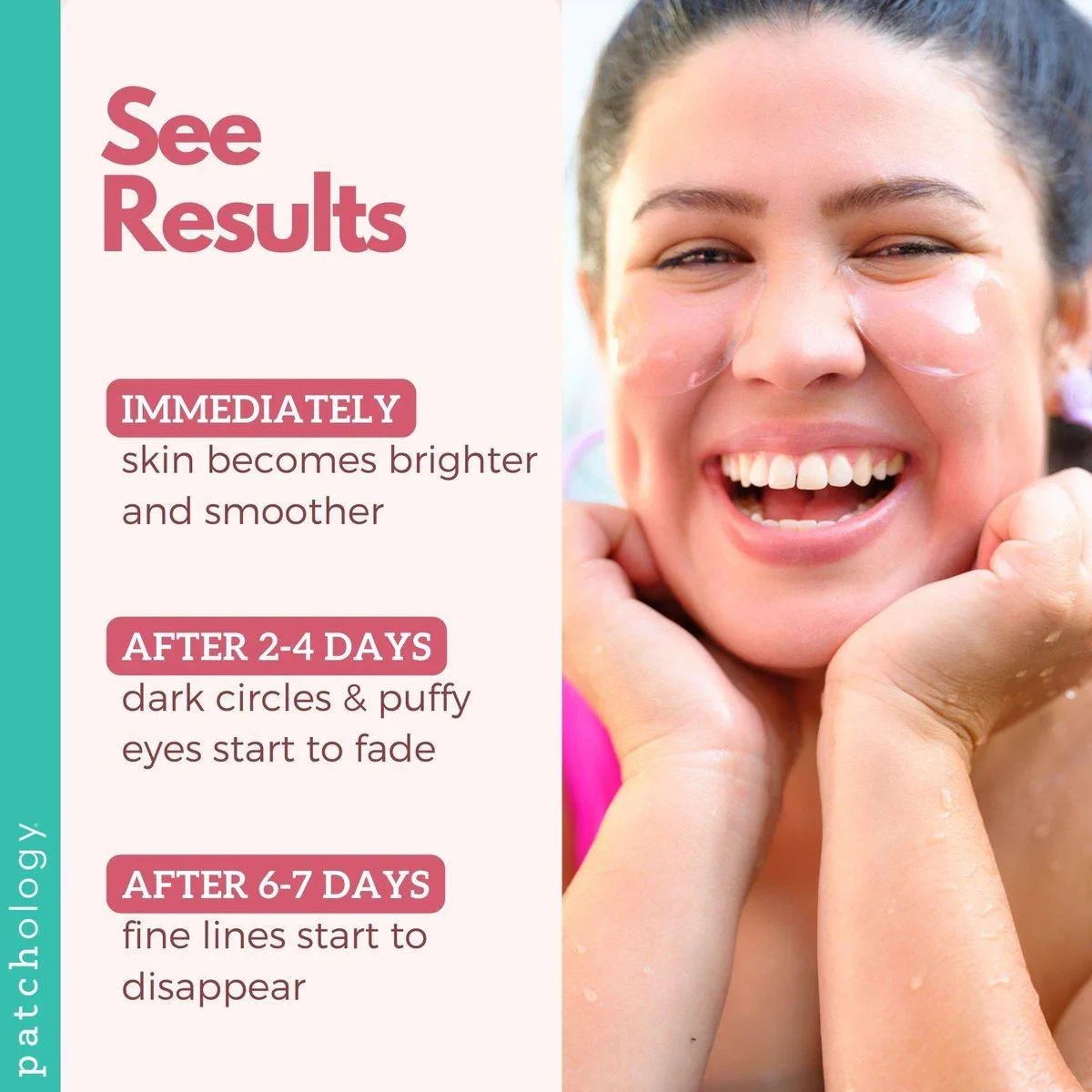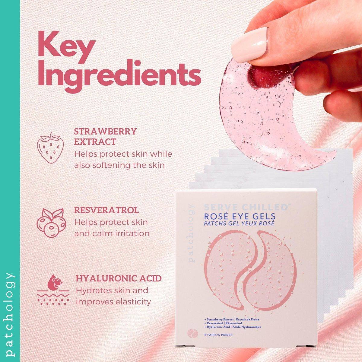 Patchology Serve Chilled Rosé Eye Gels are designed to brighten and hydrate the under-eye area. Infused with strawberry extract, resveratrol, and hyaluronic acid, these gels help reduce puffiness and fine lines. Ideal for a quick refresh, they deliver visible results in just minutes. Key Features Hydrates skin and improves elasticity Protects skin and calms irritation Brightens and smoothens skin Reduces dark circles and puffiness Minimizes fine lines Strawberry Extract, Resveratrol, Hyaluronic Acid.Patchology: Innovators in skincare, specializing in fast-acting, targeted solutions for eyes and face.Apply To Clean, Dry Skin Under The Eyes. Leave On For 10 Minutes, Then Discard After Use.For external use only. Discontinue use if irritation occurs.