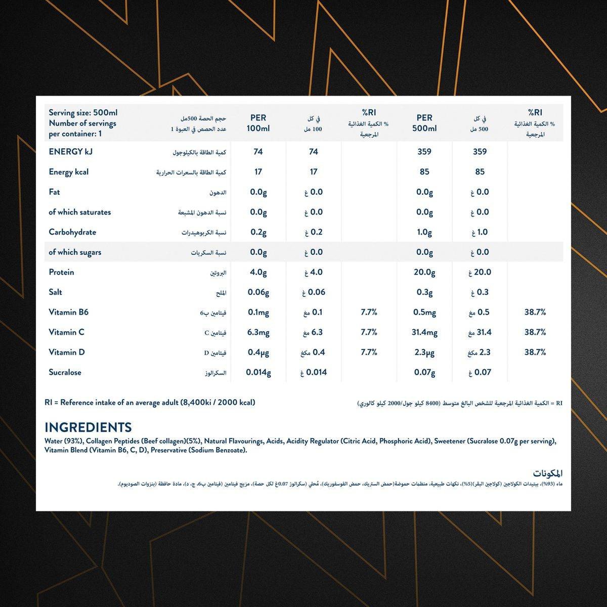 WOW Hydrate Protein Water Pro Tropical is a refreshing beverage designed to support your active lifestyle. Packed with 20g of collagen protein, BCAAs, and essential vitamins C, D, and B6, it aids in muscle recovery and immune support. This sugar-free, low-calorie drink is perfect for hydration on-the-go. Key Features Collagen protein enriched Sugar-free and fat-free Includes essential vitamins C, D, and B6 Low calorie beverage Supports immune health 500ml serving size Water (93%), Collagen Peptides (Beef collagen) (5%), Natural Flavourings, Acids, Acidity Regulator (Citric Acid, Phosphoric Acid), Sweetener (Sucralose 0.07g per serving), Vitamin Blend (Vitamin B6, C, D), Preservative (Sodium Benzoate).Innovative hydration solutions with protein and vitamins. Specializes in sugar-free, low-calorie beverages.Ready to drink. Shake well before use. Consume chilled. Use post-workout or during intense training for protein and electrolyte replenishment.Storage condition: Do not exceed 25 degrees Celsius.