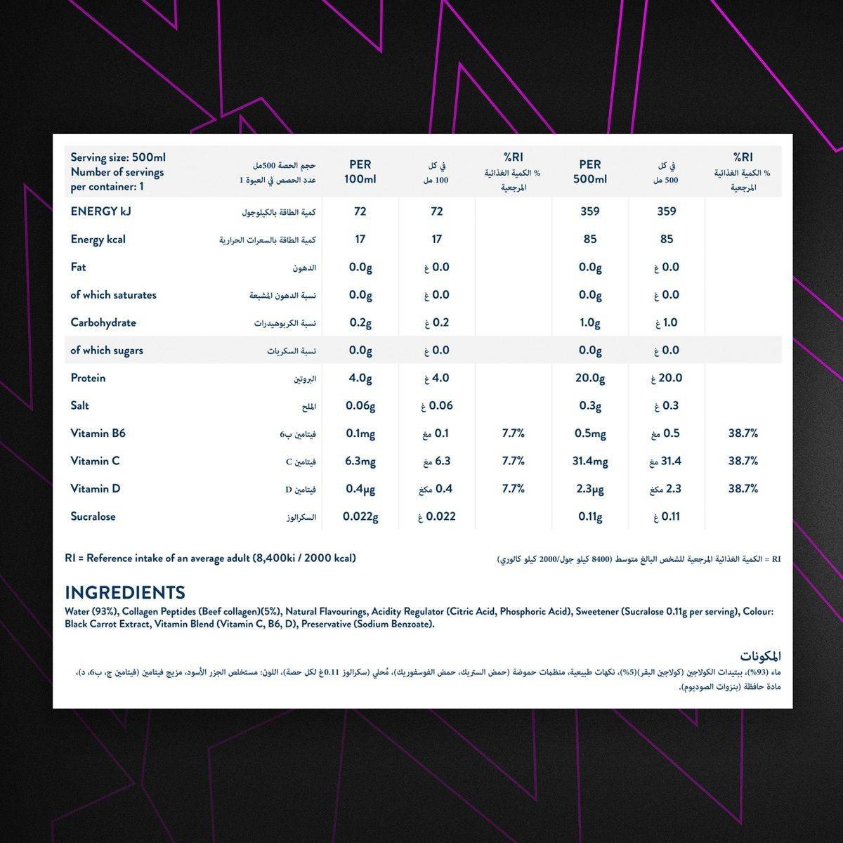 WOW Hydrate Protein Water Pro is a refreshing beverage designed for active individuals. It contains 20g of collagen protein, essential vitamins C, D, and B6, and is free from sugar, fat, and lactose. Ideal for muscle recovery and immune support, this summer fruits flavored drink is perfect for post-workout hydration. Key Features 20g Collagen Protein BCAAs to reduce muscle soreness Essential Vitamins C, D & B6 Sugar, fat, and lactose-free Immune support Low calorie Water (93%), Collagen Peptides (Beef collagen) (5%), Natural Flavourings, Acidity Regulator (Citric Acid, Phosphoric Acid), Sweetener (Sucralose 0.11g per serving), Colour: Black Carrot Extract, Vitamin Blend (Vitamin C, B6, D), Preservative (Sodium Benzoate).Innovative hydration solutions with added protein and vitamins for active lifestyles.Ready to drink. Shake well before use. Consume chilled. Use post-workout or during intense training for protein and electrolyte replenishment.Consumption Warning: Not recommended for children under 15 years or pregnant women. Consult a physician if you have a medical condition. Consume as part of a varied diet.