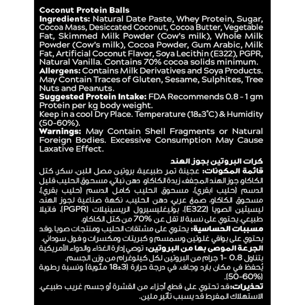 Fade Fit Protein Balls Coconut 60g are a delicious and nutritious snack packed with 11g of protein, perfect for athletes and fitness enthusiasts. Made with coconut, dates, and cocoa, they offer a sweet and nutty taste. Features Keto Friendly Preservative Free No Trans/Hydrogenated Fats Non GMO Suitable for Vegetarians Natural Date Paste, Whey Protein, Sugar, Cocoa Mass, Desiccated Coconut, Cocoa Butter, Vegetable Fat, Skimmed Milk Powder (Cow’s milk), Whole Milk Powder (Cow’s milk), Cocoa Powder, Gum Arabic, Milk Fat, Artificial Coconut Flavor, Soya Lecithin (E322), PGPR, Natural Vanilla.Fade Fit offers nutritious snacks designed for active lifestyles, focusing on protein-rich options.Ready to eat. Consume as a protein snack.May contain shell fragments or natural foreign bodies. Excessive consumption may cause laxative effect.