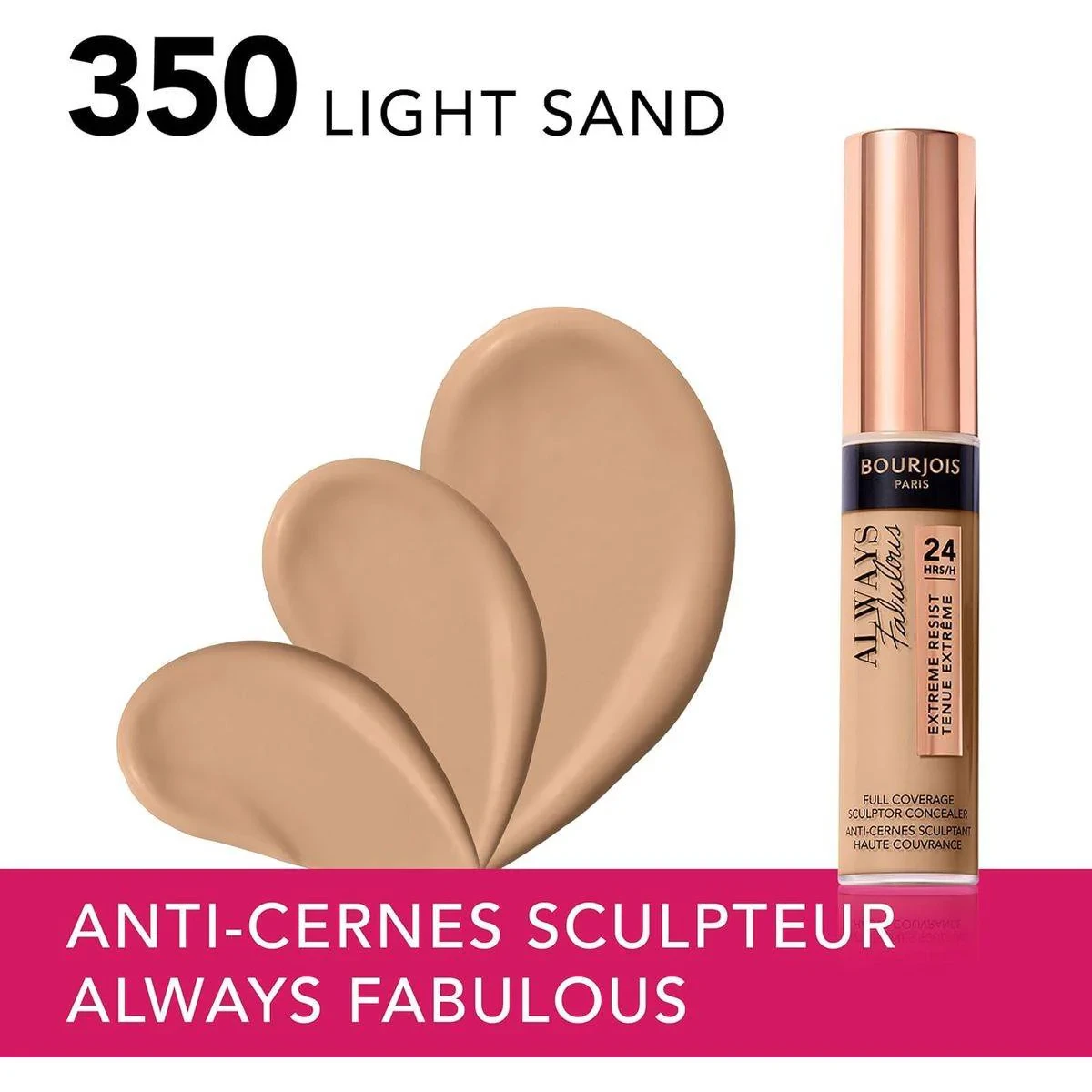 Bourjois Always Fabulous Concealer offers high coverage with a light, creamy texture and semi-matte finish. Its hydrating formula contains hyaluronic acid, erasing imperfections and dark circles while leaving skin feeling hydrated. The foam applicator ensures easy and precise application. Features Long-lasting liquid concealer Conceals, contours, and brightens Up to 24 hours wear Velvety finish SPF 20 protection Large, soft-touch applicator Hyaluronic AcidBourjois: French cosmetics brand renowned for innovative makeup solutions and chic Parisian style.Draw A Triangle Under The Eye And Blend Gently With Fingertips.For external use only. Avoid direct contact with eyes. Discontinue use if irritation occurs.