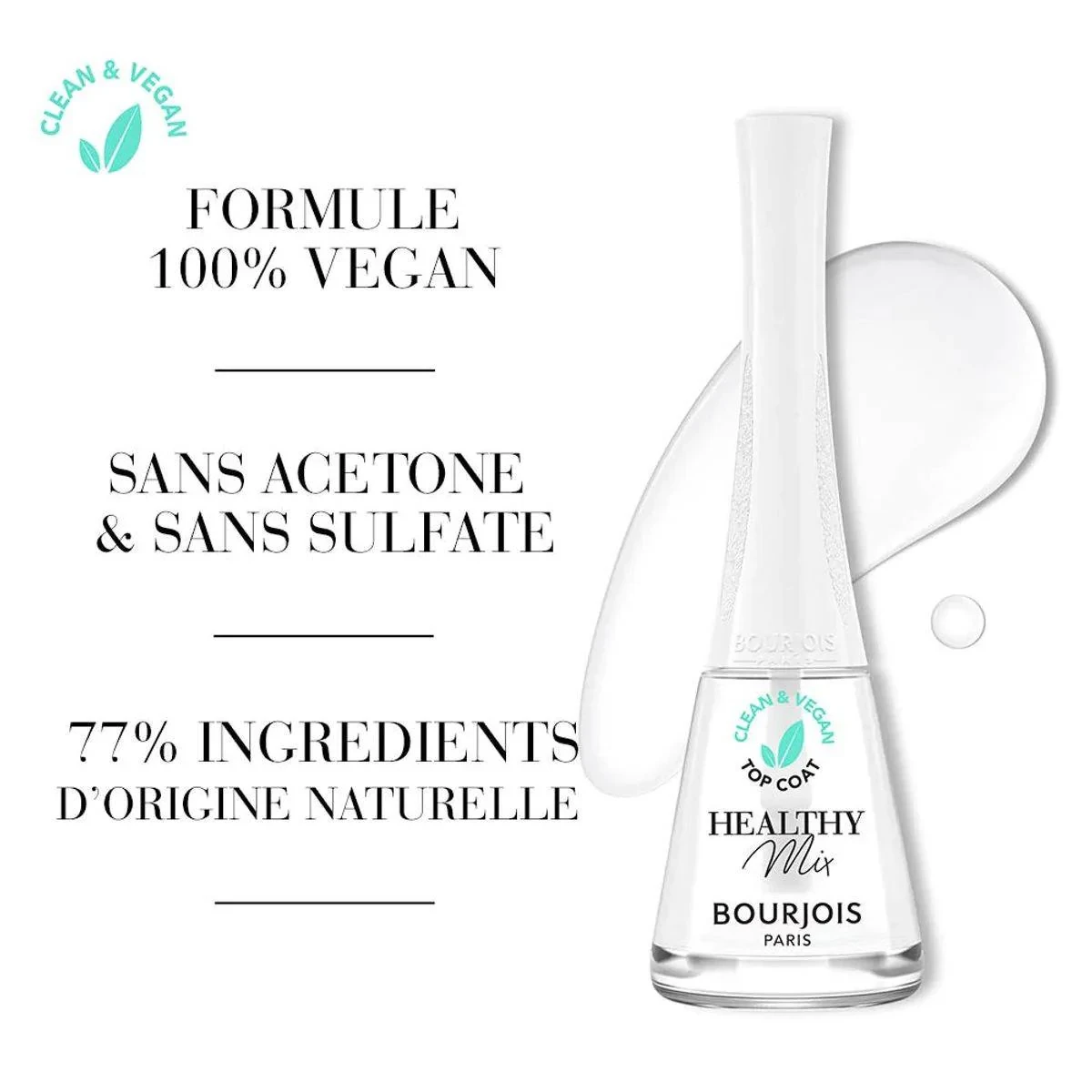 Bourjois Healthy Mix Clean Nail Polish 001 Topcoat offers a clean and vegan formula. It contains 77% ingredients of natural origin, providing a healthy finish to your nails. Key Features 100% vegan formula Acetone-free Sulfate-free 77% natural origin ingredients 100% Vegan, Sans Acetone, Sans Sulfate, 77% Ingredients D'Origine Naturelle.Bourjois: Parisian beauty brand known for innovative and affordable cosmetics.Apply 1 coat over dry nail polish to seal color and add shine.Flammable. Keep away from heat and open flame. For external use only. Avoid contact with eyes.