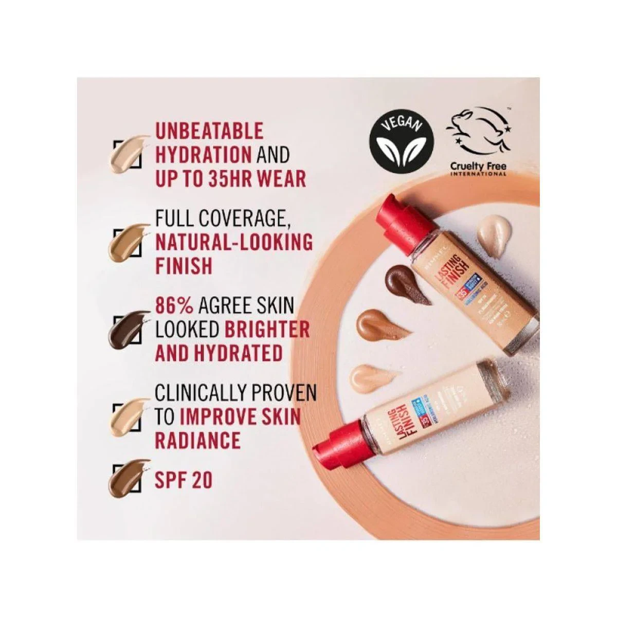 This foundation offers full coverage with a lightweight feel, ensuring a natural matte finish. Enriched with hydrating ingredients, it provides long-lasting comfort and protection with SPF 20. Key Features Full, even coverage Lightweight formula Long-lasting wear up to 25 hours Hydrating serum and Vitamin E Waterproof SPF 20 protection Hyaluronic Acid, Niacinamide, Vitamin E, Hydrating SerumRimmel London: Iconic British cosmetics brand known for trend-setting makeup products.Apply A Small Amount To Clean Skin Using Your Fingers Or A Brush. Blend Evenly, Starting From The Center Of The Face. Set With Powder For A Longer-Lasting Finish.For external use only. Discontinue use if irritation occurs. Avoid contact with eyes.