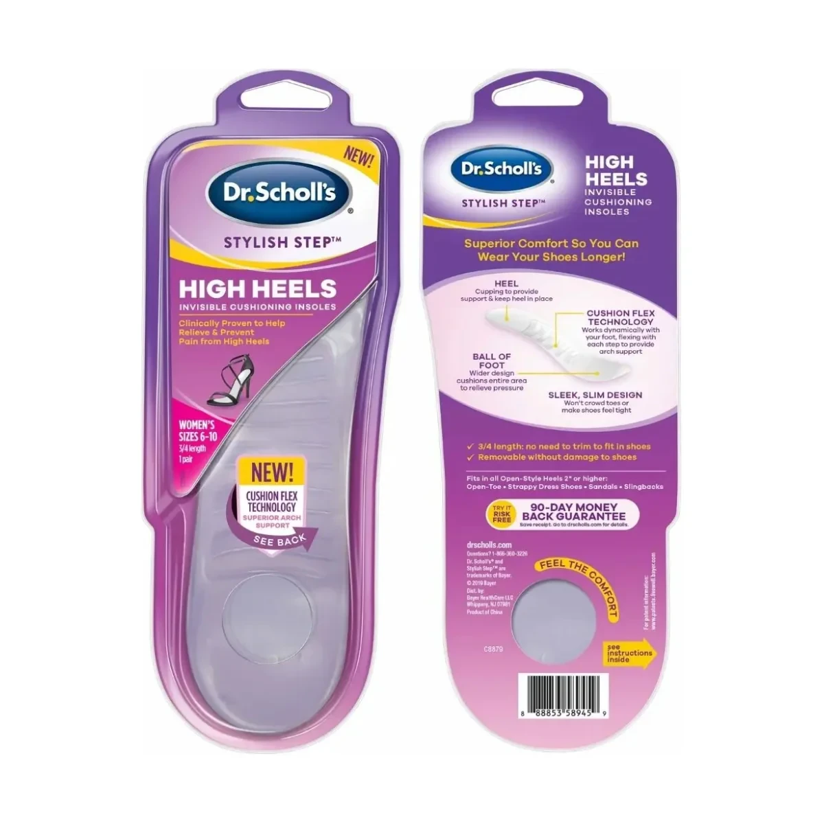 Clear, discreet, ultra-thin insoles designed to cushion the ball-of-foot and heel area to make wearing high heels comfortable for longer periods. Features: Invisible Gel Technology (doesn't show in open-toed shoes). Ultra-thin design that won't crowd the shoe. Provides all-day cushioning and pressure relief. Materials: Clear Gel Polymer (e.g., Silicone or Polyurethane), Adhesive backing.Dr. Scholl's is a globally recognized brand that provides science-based solutions for foot comfort, including cushioning products designed to make fashionable footwear easier and more comfortable to wear.Peel plastic film. Place the cushion adhesive side down in the shoe, ensuring the raised area aligns with the arch/ball of the foot (refer to package image).Discontinue Use If Discomfort Or Irritation Persists.