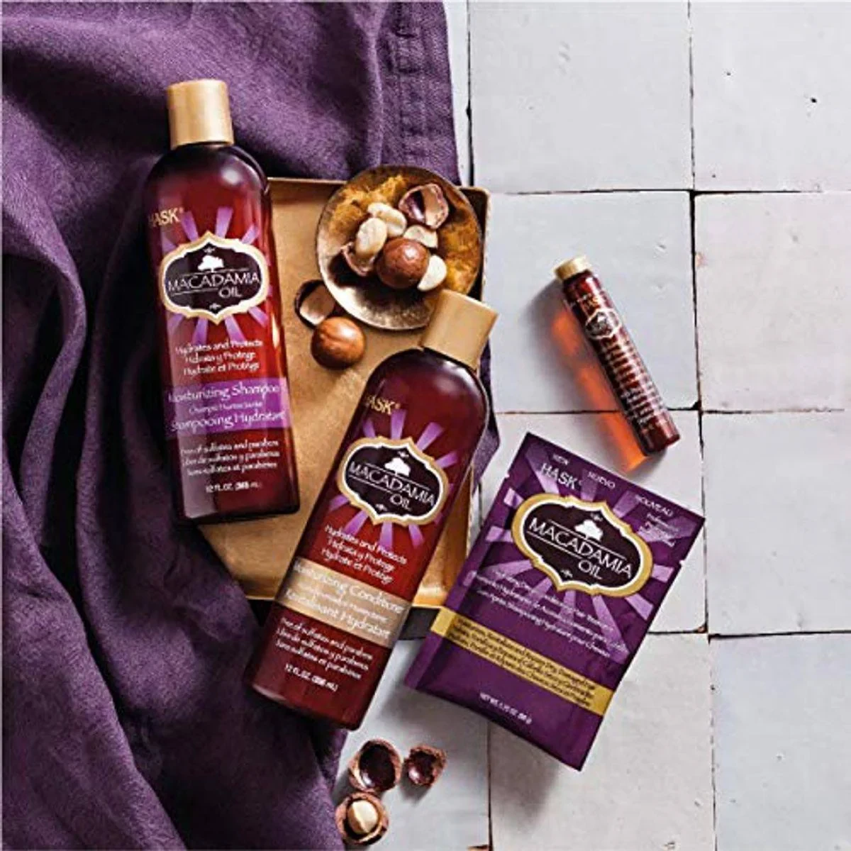 Cyclopentasiloxane, Dimethiconol, Macadamia Ternifolia Seed Oil, Keratin Amino Acids, Simmondsia Chinensis (Jojoba) Seed Oil, Glycine Soja (Soybean) Oil, Tocopherol, Aqua/Water/Eau, Iodopropynyl Butylcarbamate, Benzophenone-3, Phenyl Trimethicone, Peg-4 Dilaurate, Peg-4 Laurate, Peg-4, Ethylhexyl Methoxycinnamate, Bht, Butylene Glycol, Phenoxyethanol, Ethylhexylglycerin, Parfum/Fragrance, Butylphenyl Methylpropional, Benzyl Benzoate, Ci 47000 (Yellow 11), Ci 26100 (Red 17).Hask: Known for nourishing hair care products, specializing in macadamia oil treatments.Apply A Coin-Sized Amount Evenly Throughout Wet Or Dry Hair, Avoiding The Root Area.For external use only. Flammable (Oil/Solvent). Keep away from heat. Slip Hazard: May cause surfaces to be slippery.