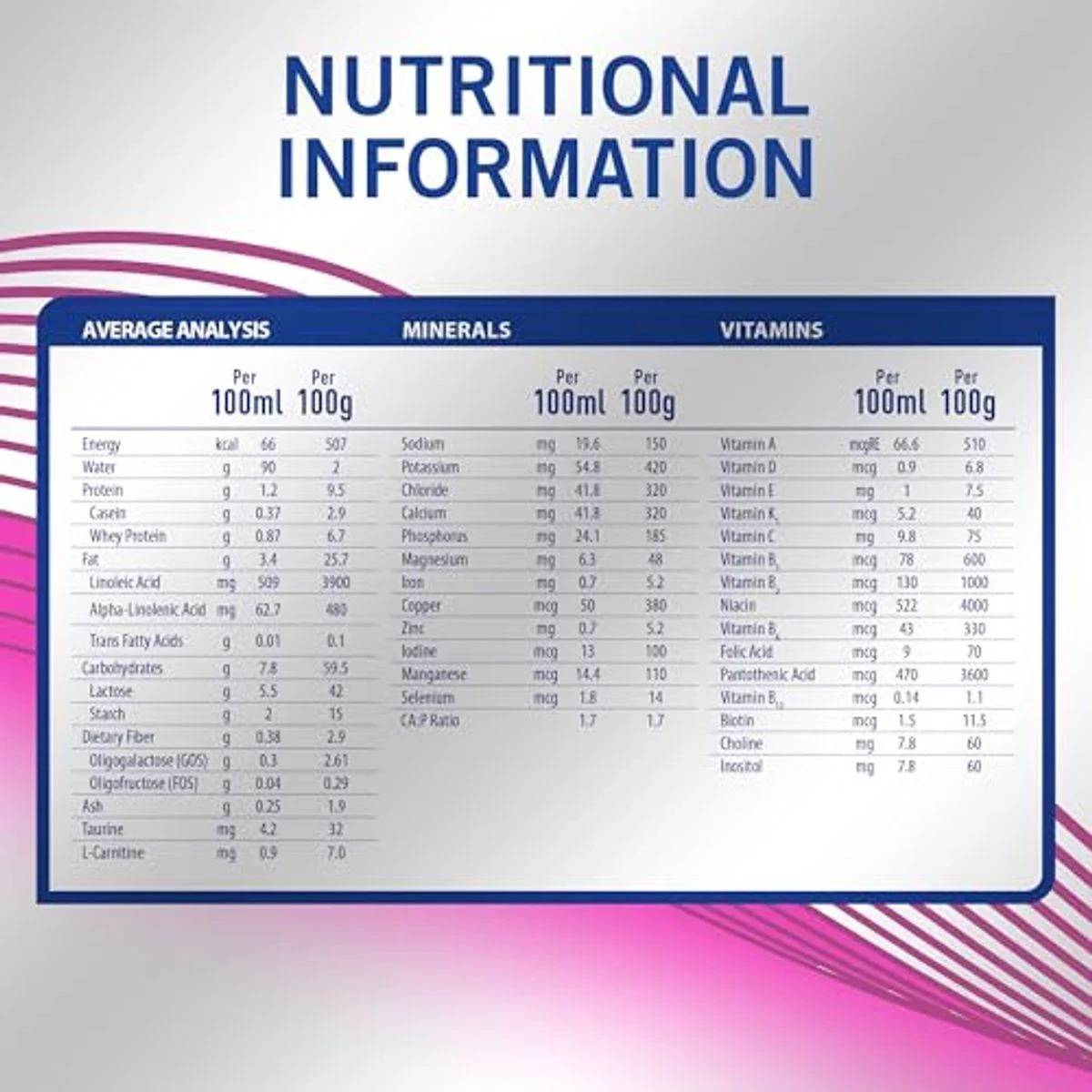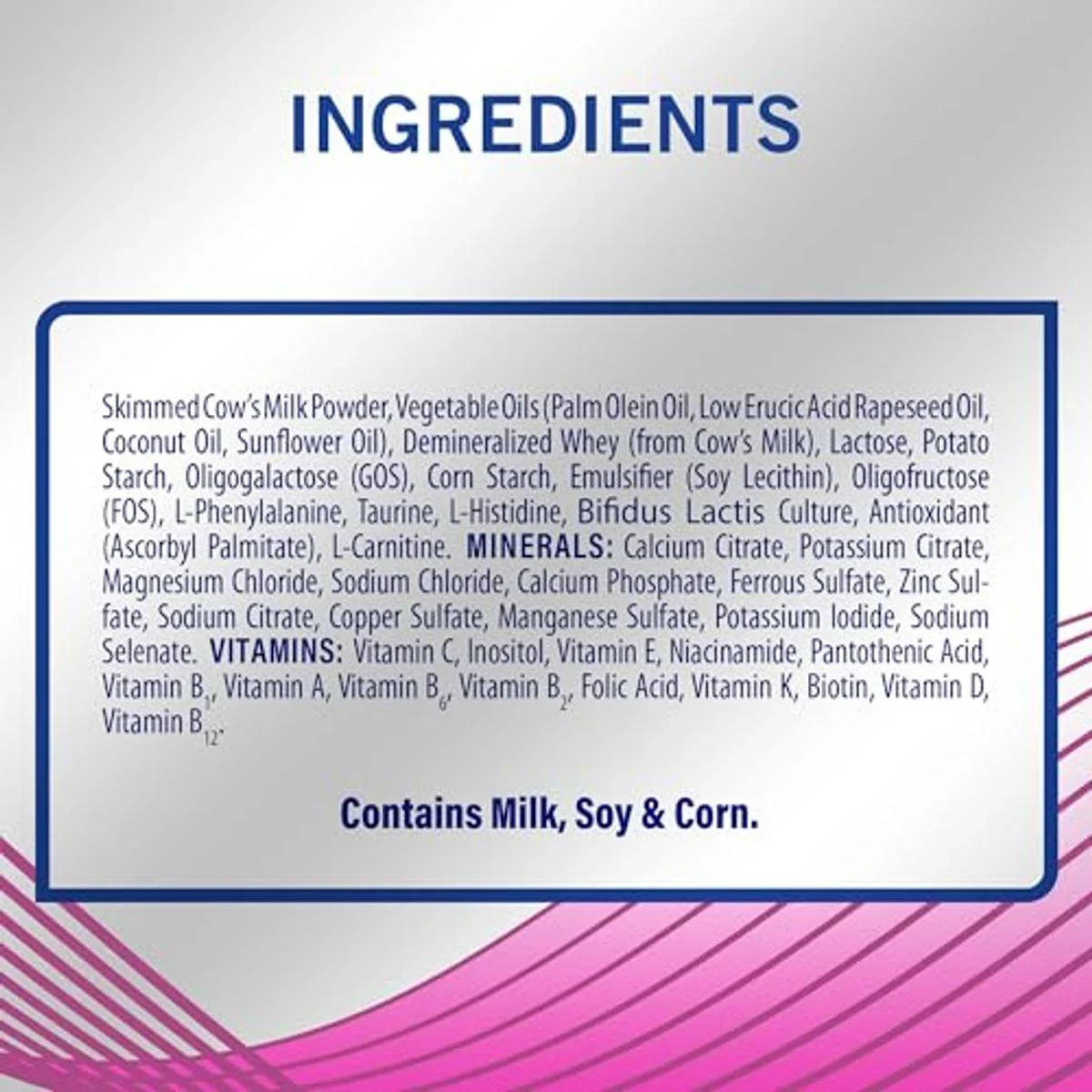 Skimmed Cow'S Milk Powder, Vegetable Oils (Palm Olein Oil, Low Erucic Acid Rapeseed Oil, Coconut Oil, Sunflower Oil), Demineralized Whey (From Cow'S Milk), Lactose, Potato Starch, Oligogalactose (Gos), Corn Starch, Emulsifier (Soy Lecithin), Oligofructose (Fos), L-Phenylalanine, Taurine, L-Histidine, Bifidus Lactis Culture, Antioxidant (Ascorbyl Palmitate), L-Carnitine, Minerals: Calcium Citrate, Potassium Citrate, Magnesium Chloride, Sodium Chloride, Calcium Phosphate, Ferrous Sulfate, Zinc Sulfate, Sodium Citrate, Copper Sulfate, Manganese Sulfate, Potassium Iodide, Sodium Selenate, Vitamins: Vitamin C, Inositol, Vitamin E, Niacinamide, Pantothenic Acid, Vitamin B1, Vitamin A, Vitamin B2, Vitamin B6, Folic Acid, Vitamin K, Biotin, Vitamin D, Vitamin B12. Contains Milk, Soy & Corn.Wyeth: Leaders in infant nutrition, providing trusted solutions for healthy growth and development.Use As Directed By Your Healthcare Professional. Mix With Previously Boiled Water Cooled To Body Temperature.Medicated Warning: Use only under medical supervision (as Anti-Regurgitation formula changes consistency). Consult a doctor before making any changes.