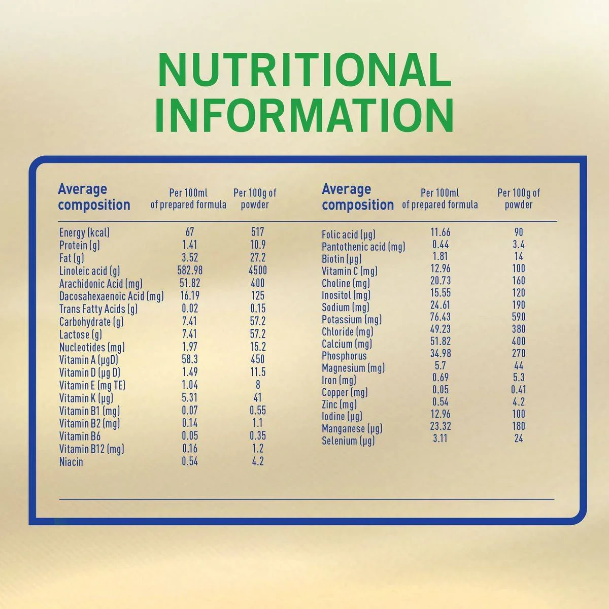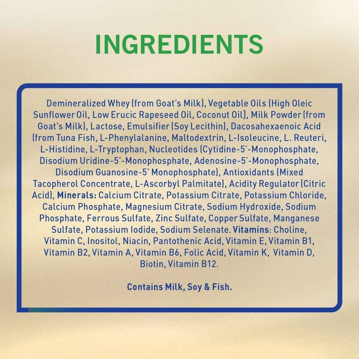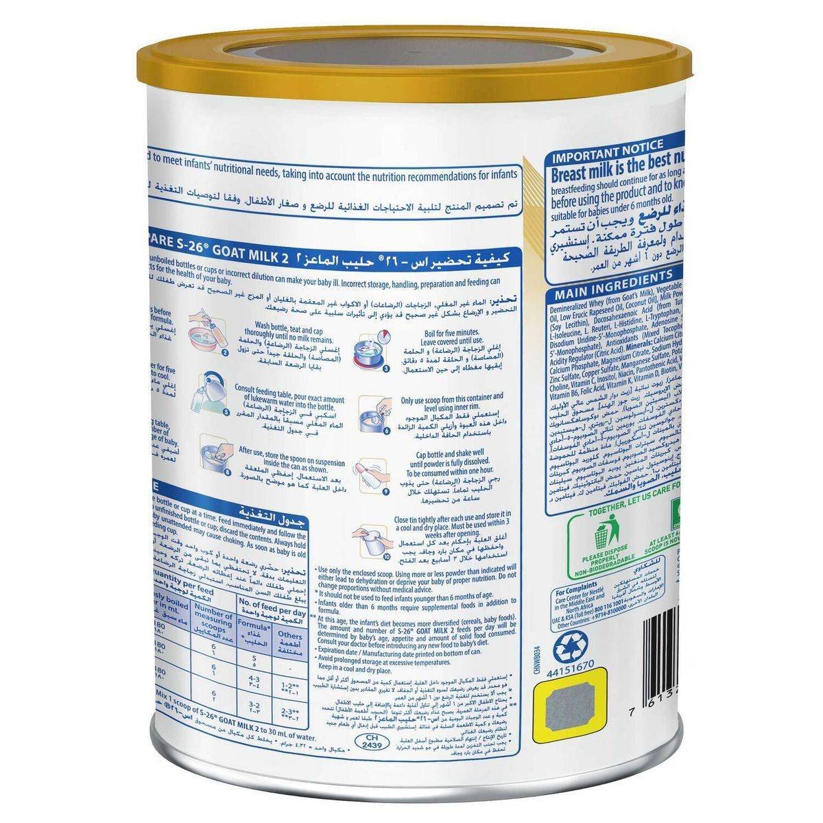 Demineralized Whey (from Goat's Milk), Vegetable Oil, Low Erucic Rapeseed Oil, Coconut Oil, Milk Powder, Soy Lecithin, Docosahexaenoic Acid, L-Isoleucine, L-Reuteri, L-Histidine, L-Tryptophan, Disodium Uridine-phosphate, Adenosine 5'-Monophosphate, Acidity Regulator (Citric Acid), Calcium Citrate, Calcium Phosphate, Magnesium Citrate, Sodium Hydroxide, Zinc Sulfate, Copper Sulfate, Manganese Sulfate, Choline, Vitamin C, Inositol, Niacin, Pantothenic Acid, Vitamin B6, Folic Acid, Vitamin K, Vitamin D, Biotin.Wyeth: Leaders in infant nutrition, providing trusted formulas for healthy development.Mix 1 scoop of S-26 Goat Milk 2 to 30 mL of water. Use only the enclosed scoop.WARNING: Unboiled water, unboiled bottles or cups or incorrect dilution can make your baby ill. Incorrect storage, handling, preparation and feeding can potentially lead to adverse effects for the health of your baby. Prepare only one bottle or cup at a time. Feed immediately and follow the instructions exactly. Do not keep unfinished bottle or cup; discard the contents. Always hold baby while feeding. Leaving baby unattended may cause choking. As soon as baby is old enough replace bottle with a feeding cup.