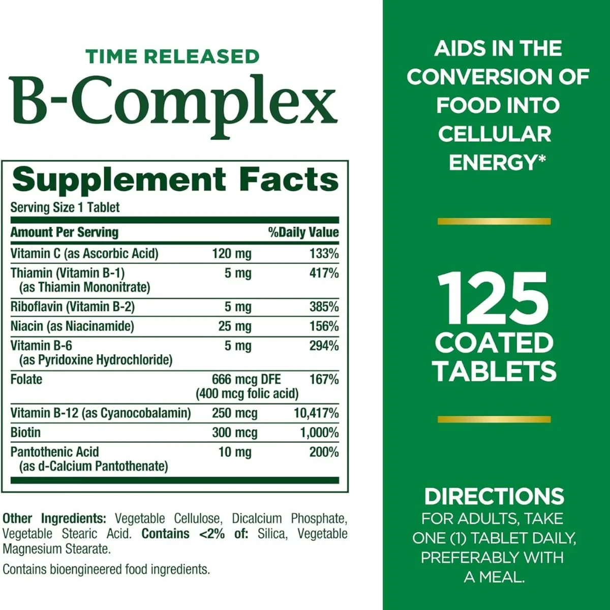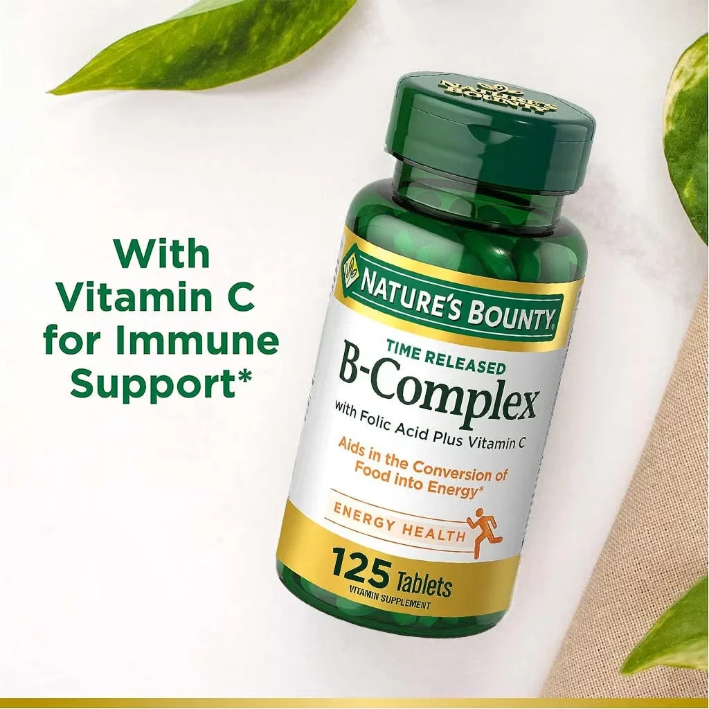 Natures Bounty B Complex Time Released 125 TabletsB vitamins such as B1, B2, B3, B5, B6, B12, folic acid, and biotin.Time-release B-Complex formula that supports energy production, nervous system health, and stress management. Supplied in a bottle of 125 tablets.As labelled or as directed by healthcare practionerDo not exceed the recommended dose or as advised by health care practioner