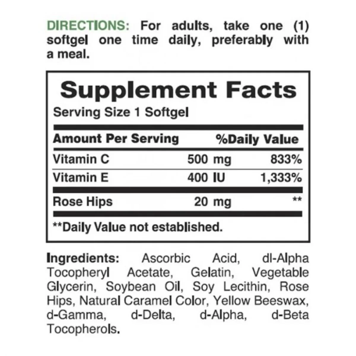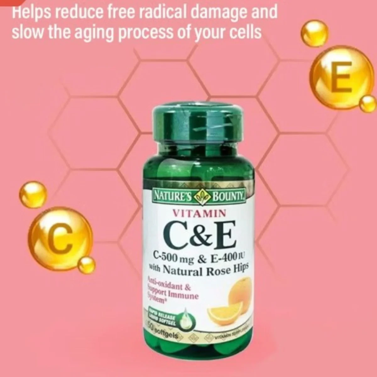 Natures Bounty Vitamin C & E 50 SoftgelVitamin C, Vitamin EThis product offers 50 softgels, combining Vitamin C and Vitamin E as powerful antioxidants to support immune health and cellular protection.As labelled or as directed by healthcare practionerDo not exceed the recommended dose or as advised by health care practioner