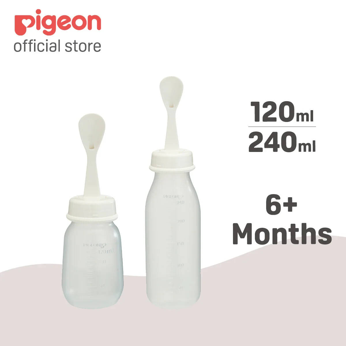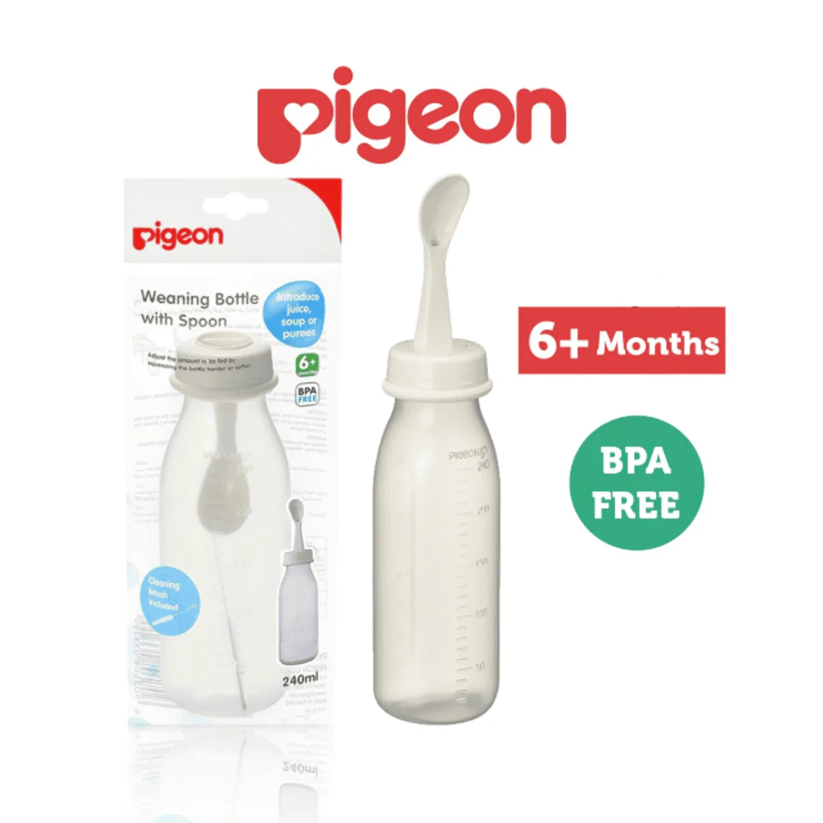 The Pigeon Weaning Bottle with Spoon is perfect for introducing juice, soup, or purees to your baby's diet. Designed with a squeeze-to-feed mechanism, it allows parents to control the amount of food by adjusting the pressure applied to the bottle, making feeding easier and more comfortable for the baby. Crafted with an anti-colic air system, it ensures minimal air intake during feeding, preventing gas and discomfort. Made from BPA-free materials, it is safe for everyday use and easy to clean with the included cleaning brush. Lightweight and portable, this weaning bottle is a must-have for smooth weaning transitions. Key Features Introduce juice, soup, or purees Adjust feeding amount with squeeze control BPA-Free and anti-colic air system Easy to clean, includes cleaning brush Supports transition from bottle to spoon feeding Key Materials: Bottle (plastic/PP); Soft silicone spoon; Plastic cap/collar.Experts in baby care essentials and innovative feeding solutions.Adjust The Amount To Be Fed By Squeezing The Bottle Harder Or Softer.Choking Hazard: Inspect spoon/nipple for tears before each use. Always use under adult supervision. Do not use spoon attachment for feeding without adult supervision.