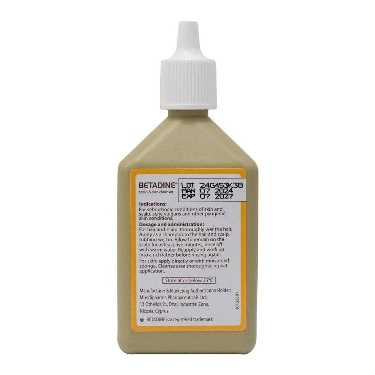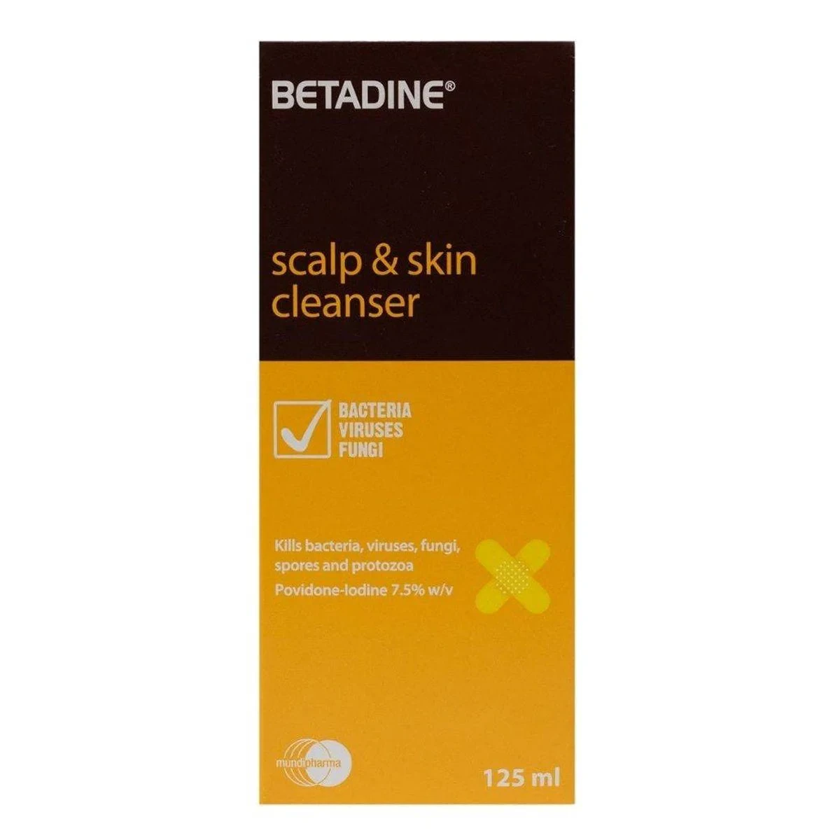 Betadine Scalp & Skin Cleanser is an antiseptic solution containing Povidone-Iodine 7.5% w/v. It is designed to treat and prevent infections in wounds, seborrhoeic conditions of the skin and scalp, acne vulgaris, and other pyogenic skin conditions. The cleanser kills bacteria, viruses, fungi, spores, and protozoa, providing a broad microbicidal spectrum. It is non-irritating to skin and mucosa, and helps prevent the spread of seborrhoeic dermatitis. Key Features Kills bacteria, viruses, fungi, spores, and protozoa Contains Povidone-Iodine 7.5% w/v Non-selective microbicidal action Used for seborrhoeic conditions of skin and scalp Treatment and prevention of infections in wounds Broad microbicidal spectrum Non-irritating to skin and mucosa Stable dermophil pH Non-staining to skin and natural fabrics Povidone-Iodine 7.5% w/v.Betadine: Trusted antiseptic solutions for skin and scalp care.For hair and scalp: Thoroughly wet the hair. Apply as a shampoo to the hair and scalp, rubbing well in. Allow to remain on the scalp for at least five minutes, rinse off with warm water. Reapply and work up into a rich lather before rinsing again. For skin: Apply directly or with moistened sponge. Cleanse area thoroughly; repeat application.If symptoms persist, consult your healthcare practitioner.