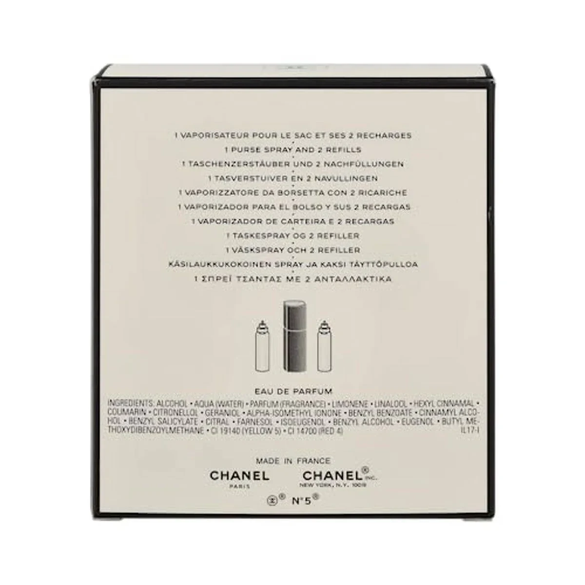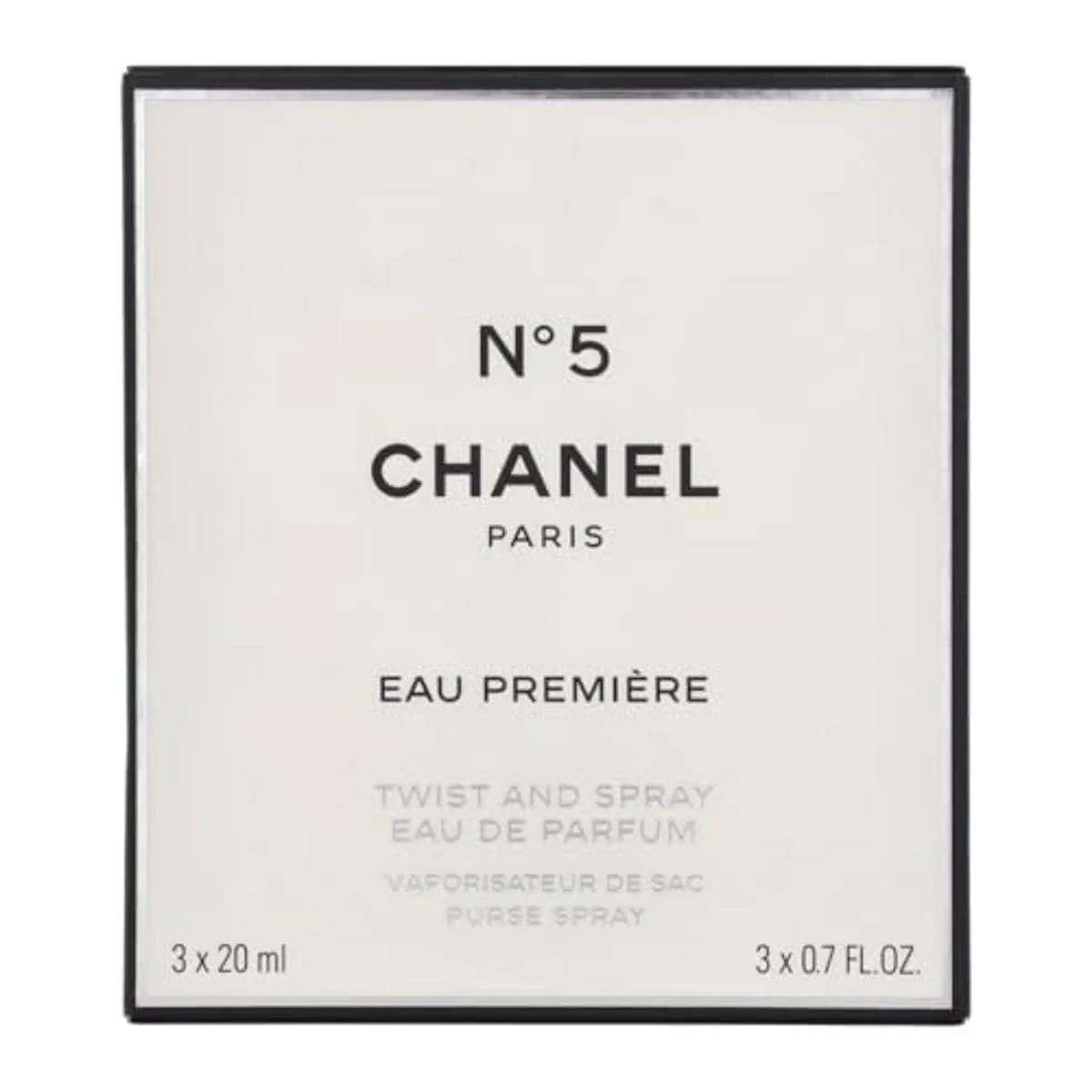 Chanel No.5 Eau Premiere is a luxurious purse spray set featuring a luminous interpretation of the iconic classic. With soft floral notes and a warm base, it exudes sophistication and grace, perfect for any occasion. Refillable purse spray Soft and luminous aldehyde floral bouquet Includes 3 x 20 ml bottles Suitable for travel Elegant and sophisticated fragrance Subtle interpretation of classic No.5 Light and airy scent Features ylang-ylang, May rose, jasmine Warm base of vetiver and sandalwood Designed for generous use ALCOHOL, AQUA (WATER), PARFUM (FRAGRANCE), LIMONENE, LINALOOL, HEXYL CINNAMAL, COUMARIN, CITRONELLOL, GERANIOL, ALPHA-ISOMETHYL IONONE, BENZYL BENZOATE, CINNAMYL ALCOHOL, BENZYL SALICYLATE, CITRAL, FARNESOL, ISOEUGENOL, BENZYL ALCOHOL, EUGENOL, BUTYL METHOXYDIBENZOYLMETHANE, CI 19140 (YELLOW 5), CI 14700 (RED 4), IL17-1.Chanel is renowned for its timeless elegance and luxurious fragrances, epitomizing sophistication and style.Not SpecifiedKeep out of reach of children and store away from direct sunlight.