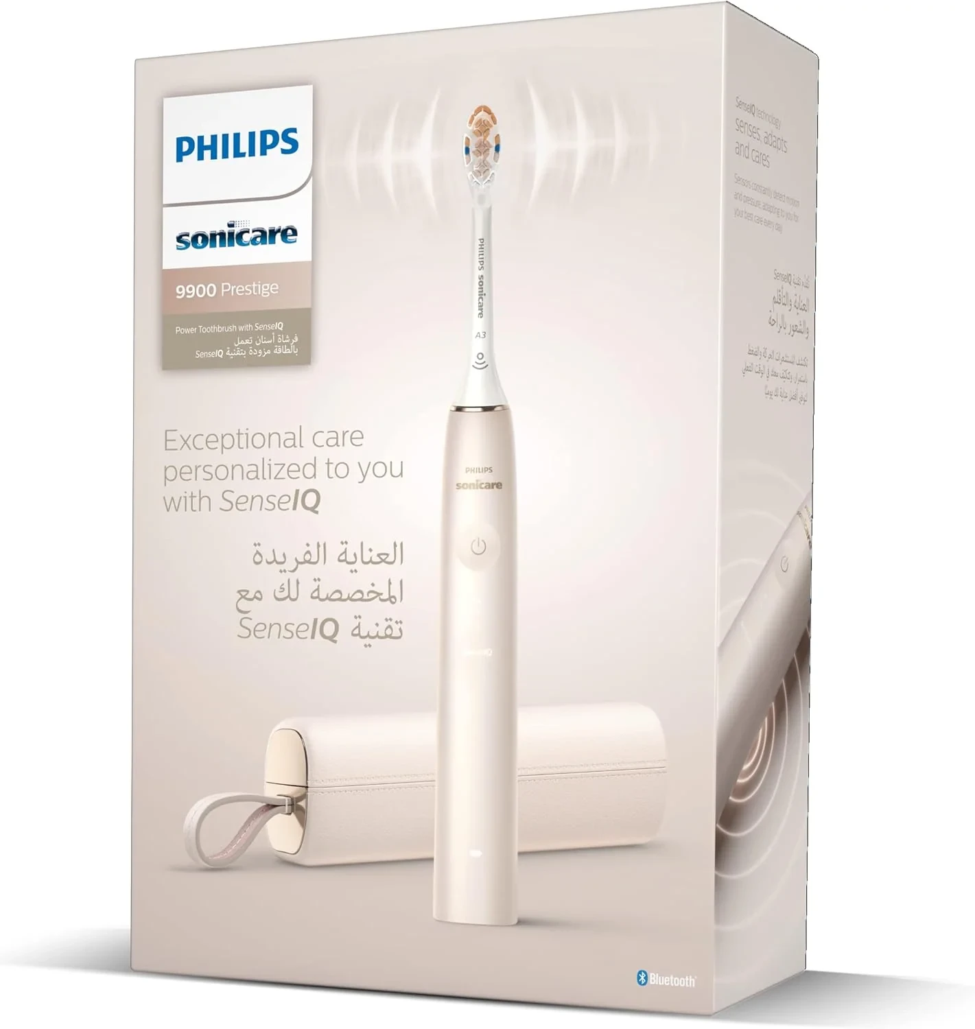 The Philips Sonicare 9900 Prestige Electric Toothbrush offers advanced oral care with SenseIQ technology, removing up to 20x more plaque and improving gum health by 15x. Featuring multiple modes and intensities, it provides personalized brushing experiences. Key Features Removes up to 20x more plaque Improves gum health by up to 15x 100% more stain removal in less than two days Pressure sensor alerts for excessive pressure Offers 5 modes and 3 intensity levels 62,000 brush movements per minute 14 days battery life on a full charge Compatible with Sonicare app for personalized guidance The Philips Sonicare 9900 Prestige Electric Toothbrush offers advanced oral care with SenseIQ technology, removing up to 20x more plaque and improving gum health by 15x. Featuring multiple modes and intensities, it provides personalized brushing experiences.Use With Philips Sonicare Chargers Only.Not Suitable For Children Under 3 Years, Requires Adult Supervision For Young Users.