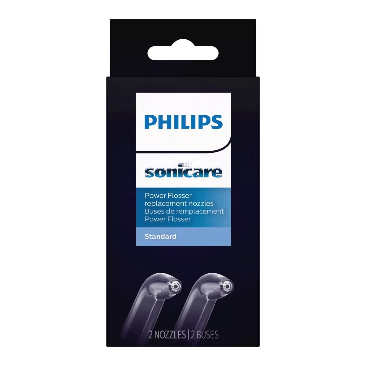 The Philips Sonicare Standard F1 Oral Irrigator Nozzle is designed for use with any Philips Sonicare Power Flosser. It offers a powerful clean by using a single stream of water to efficiently remove debris between teeth, promoting a healthier gum line. The nozzle is easy to use with a slim, angled design and guidance tip for correct placement. The set includes two F1 Standard Nozzles and is recommended for replacement every six months. Features Single stream of water for thorough cleaning Slim angled nozzle with guidance tip Compatible with any Philips Sonicare Power Flosser Recommended nozzle replacement every 6 months Not SpecifiedInnovative oral healthcare solutions