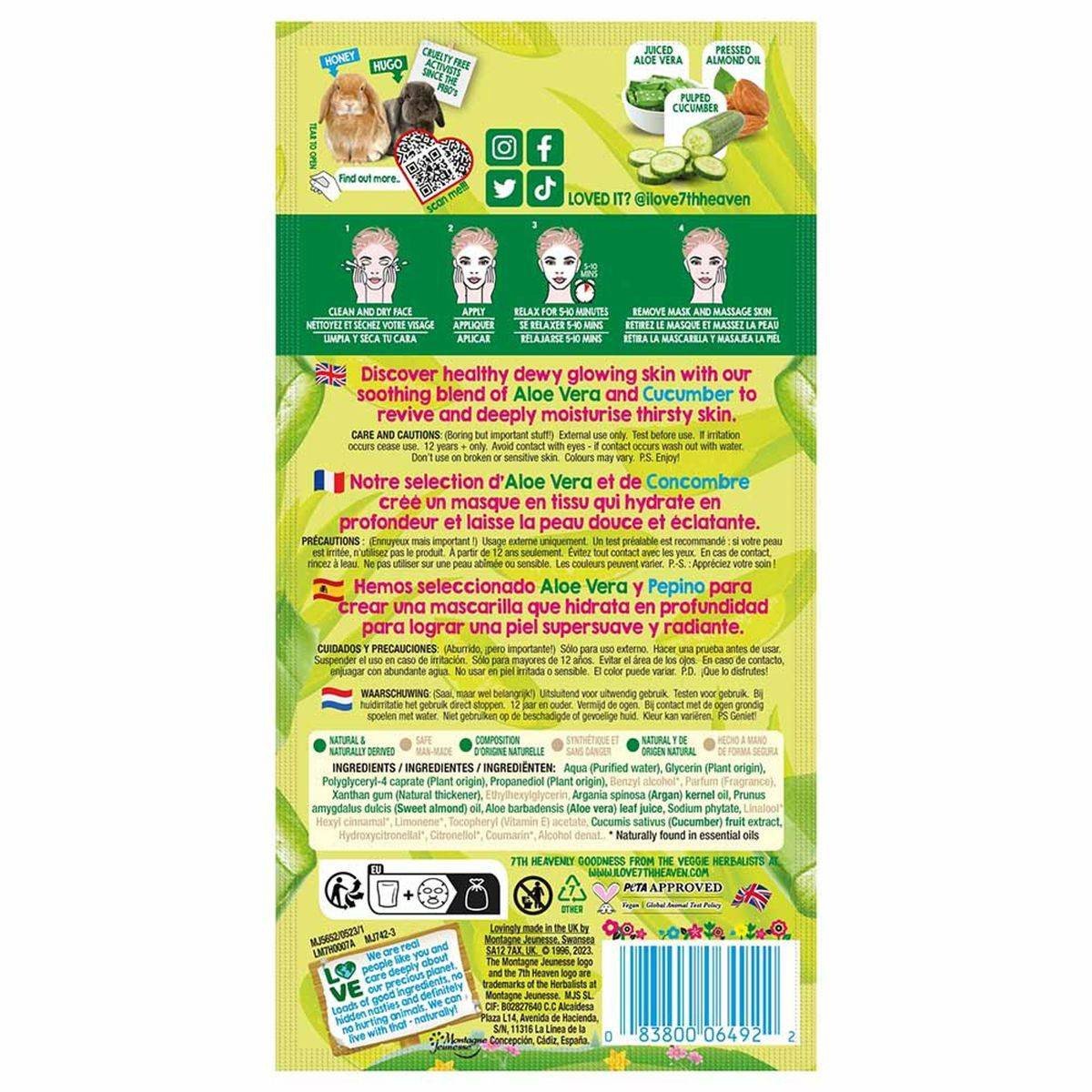 Discover healthy, dewy, glowing skin with our soothing blend of Aloe Vera and Cucumber to revive and deeply moisturize thirsty skin. Key Features Hydrating sheet mask Contains Aloe Vera and Cucumber Vegan and cruelty-free Biodegradable bamboo sheet Dermatologically tested Clinically proven hydration Suitable for all skin types Aqua (Purified Water), Glycerin (Plant Origin), Polyglyceryl-4 Caprate (Plant Origin), Propanediol (Plant Origin), Benzyl Alcohol, Parfum (Fragrance), Xanthan Gum (Natural Thickener), Ethylhexylglycerin, Argania Spinosa (Argan) Kernel Oil, Prunus Amygdalus Dulcis (Sweet Almond) Oil, Aloe Barbadensis (Aloe Vera) Leaf Juice, Sodium Phytate, Linalool, Hexyl Cinnamal, Limonene, Tocopheryl (Vitamin E) Acetate, Cucumis Sativus (Cucumber) Fruit Extract, Hydroxycitronellal, Citronellol, Coumarin, Alcohol Denat.Innovative skincare brand known for natural, vegan-friendly face masks.Apply to clean, dry face. Relax for 5-10 minutes. Remove mask and massage skin.External use only. Test before use. If irritation occurs cease use. 12 years+ only. Avoid contact with eyes-if contact occurs wash out with water. Don't use on broken or sensitive skin. Colours may vary.