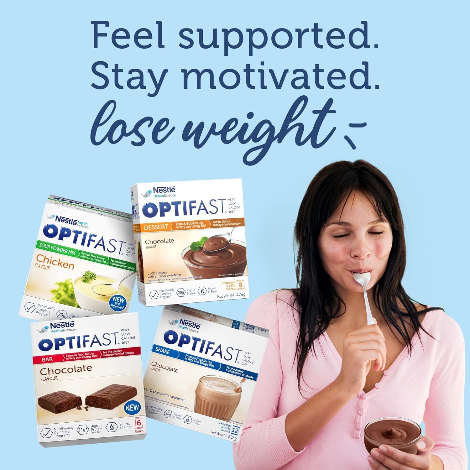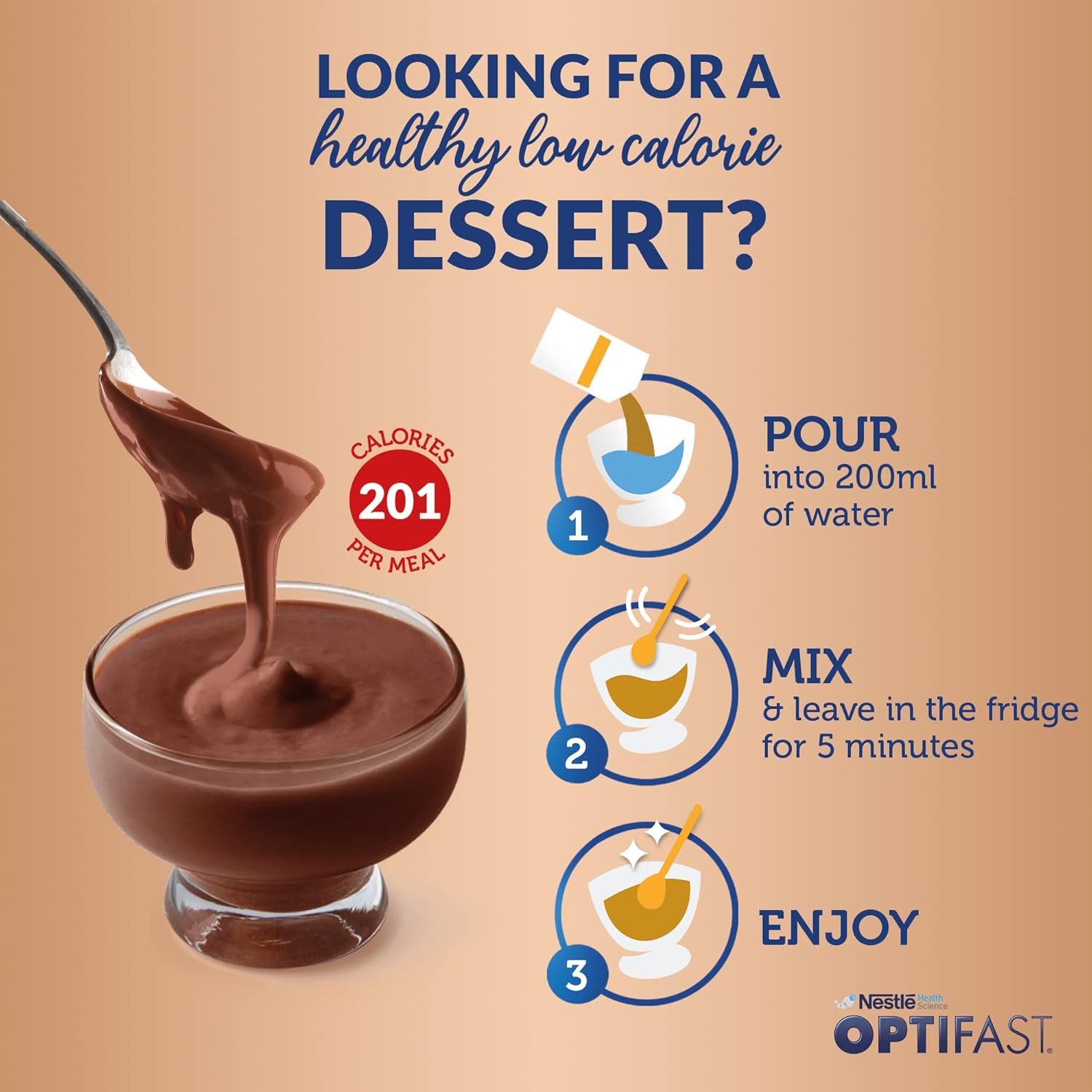 A powdered dessert mix formulated as a nutritionally complete Very Low Calorie Diet (VLCD) meal replacement with a chocolate flavor. Features: 20g Protein. Low in Calories (approx. 200 kcal). Simple to prepare by mixing with cold water. Key Ingredients: Skimmed Milk Powder, Milk Proteins (Caseinate), Fructose, Cocoa Powder, Vegetable Oils, Inulin, Minerals and Vitamins (VLCD full blend), Starch, Flavouring, Sweetener.Optifast is a specialized brand of Very Low Calorie Diet (VLCD) products (shakes, bars, soups, desserts) owned by Nestlé Health Science. The program and products are nutritionally complete but very low in energy, designed for rapid weight loss and must be used under medical supervision.Add 1 sachet (53g) to 200mL of cold water. Mix vigorously with a whisk/fork or shaker. Leave to stand for 5 minutes (preferably refrigerated). Use within 24 hours.Vlcd Warning: Use Under Medical Supervision. Not Suitable For Pregnant/Lactating Women, Infants, Children, Or Adolescents (Unless Medically Advised). Ensure Minimum 2L Of Calorie-Free Fluid Daily. Allergens: Milk, Soy.