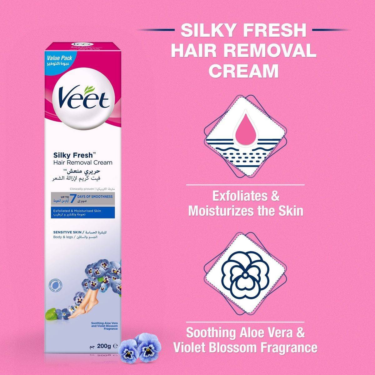 Veet Hair Removal Cream Silky Fresh is designed for sensitive skin, offering painless hair removal for legs, arms, underarms, and bikini line. Enriched with Aloe Vera, it hydrates skin for up to 24 hours, ensuring smooth and moisturized results. Features Up to 7 days of smoothness Works even on short hairs Dermatologically tested Multi-area usage: arms, underarms, bikini line, legs Contains Aloe Vera for soothing properties Eliminates ammonia odor Hydrates skin for up to 24 hours Fast and effective hair removal Gentle formula for sensitive skin Easy application with included spatula Water, Urea, Potassium Thioglycolate, Mineral Oil, Cetearyl Alcohol, Potassium Hydroxide, Calcium Hydroxide, Talc, Ceteareth 20, Glycerin, Sorbitol, Fragrance/Parfum, Magnesium Trisilicate, Titanium Dioxide, Propylene Glycol, Lithium Magnesium Sodium Silicate, Acrylate Copolymer, Sodium Gluconate, Tocopheryl Acetate, Aloe Barbadensis Leaf Juice, Potassium Sorbate, Sodium Benzoate.Veet: Leading brand in hair removal, offering gentle and effective solutions for silky smooth skin.Apply cream evenly, leave for 5 10 minutes, then rinse.Always Perform A Patch Test. Avoid Contact With Eyes And Broken Skin. Discontinue Use If Irritation Occurs. Keep Out Of Reach Of Children.