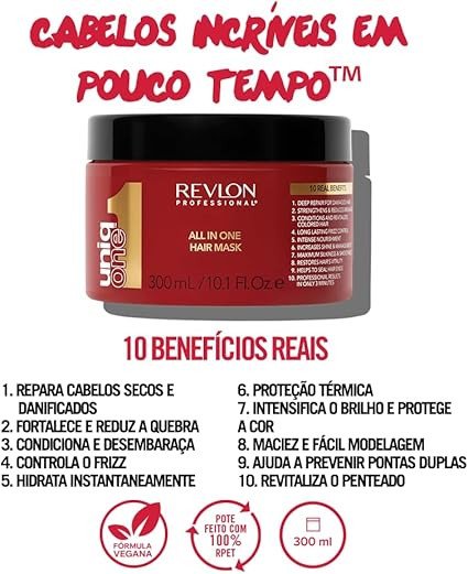 Revlon Professional Uniq One All In One Hair Mask is a deep conditioning treatment designed for all hair types. It offers 10 real benefits including deep repair, intense nourishment, and long-lasting frizz control. The mask is vegan and provides professional results in just 3 minutes. Key Features
