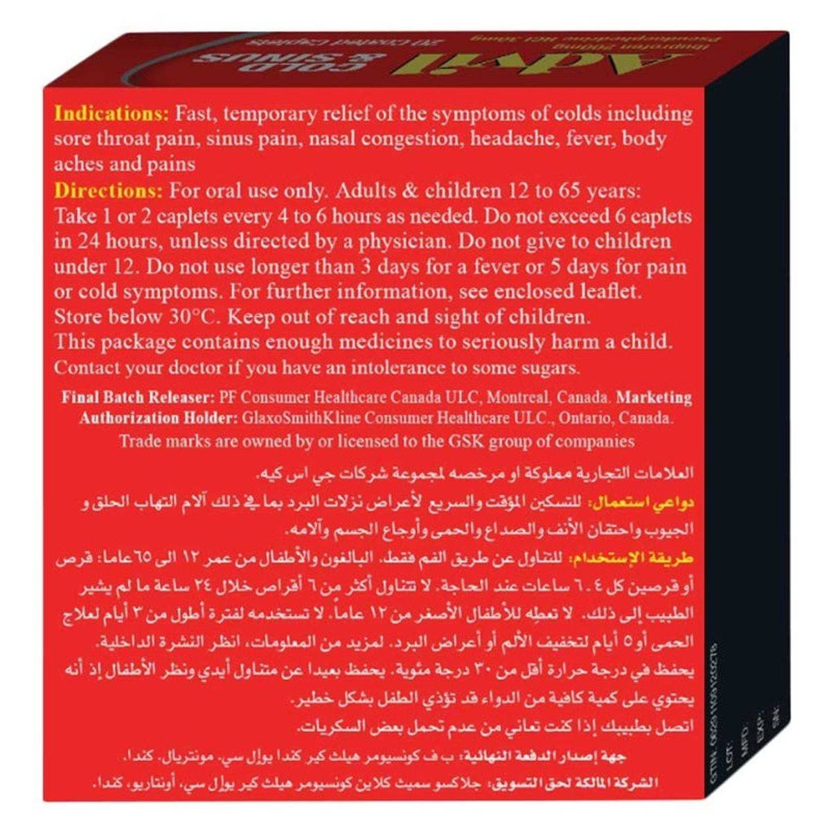 Advil Cold & Sinus 20 Caplets provide effective relief from cold symptoms including sore throat, sinus pain, nasal congestion, headache, fever, and body aches. Non-drowsy formula with a powerful decongestant and Advil for pain relief. Key Features Non-drowsy formula Relieves sinus pain and fever Alleviates headache Reduces nasal congestion Ibuprofen 200 mg, Pseudoephedrine HCI 30 mg.Advil: Trusted for effective pain and fever relief, known for its range of over-the-counter medications.For oral use only. Adults & children 12 to 65 years: Take 1 or 2 caplets every 4 to 6 hours as needed.Do not give to children under 12.