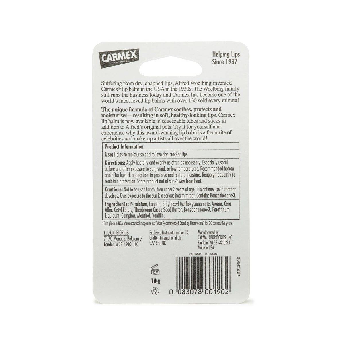 Petrolatum, Lanolin, Ethylhexyl Methoxycinnamate, Aroma, Cera Alba, Cetyl Esters, Theobroma Cacao Seed Butter, Benzophenone-3, Paraffinum Liquidum, Camphor, Menthol, Vanillin.Carmex Lip Balm Tube Strawberry 10g offers a unique formula that soothes, moisturizes, and relieves lips, resulting in soft, healthy-looking lips. It is available in squeezable tubes and sticks, providing long-lasting relief for dry, chapped lips by soothing, protecting, and moisturizing.Apply Liberally And Evenly As Often As Necessary. Especially Useful Before And After Exposure To Sun, Wind, Or Low Temperatures. Recommended Before And After Lipstick Application To Preserve And Restore Moisture. Reapply Frequently To Maintain Protection.Not To Be Used For Children Under 3 Years Of Age. Discontinue Use If Irritation Develops. Over-Exposure To The Sun Is A Serious Health Threat. Contains Benzophenone-3.