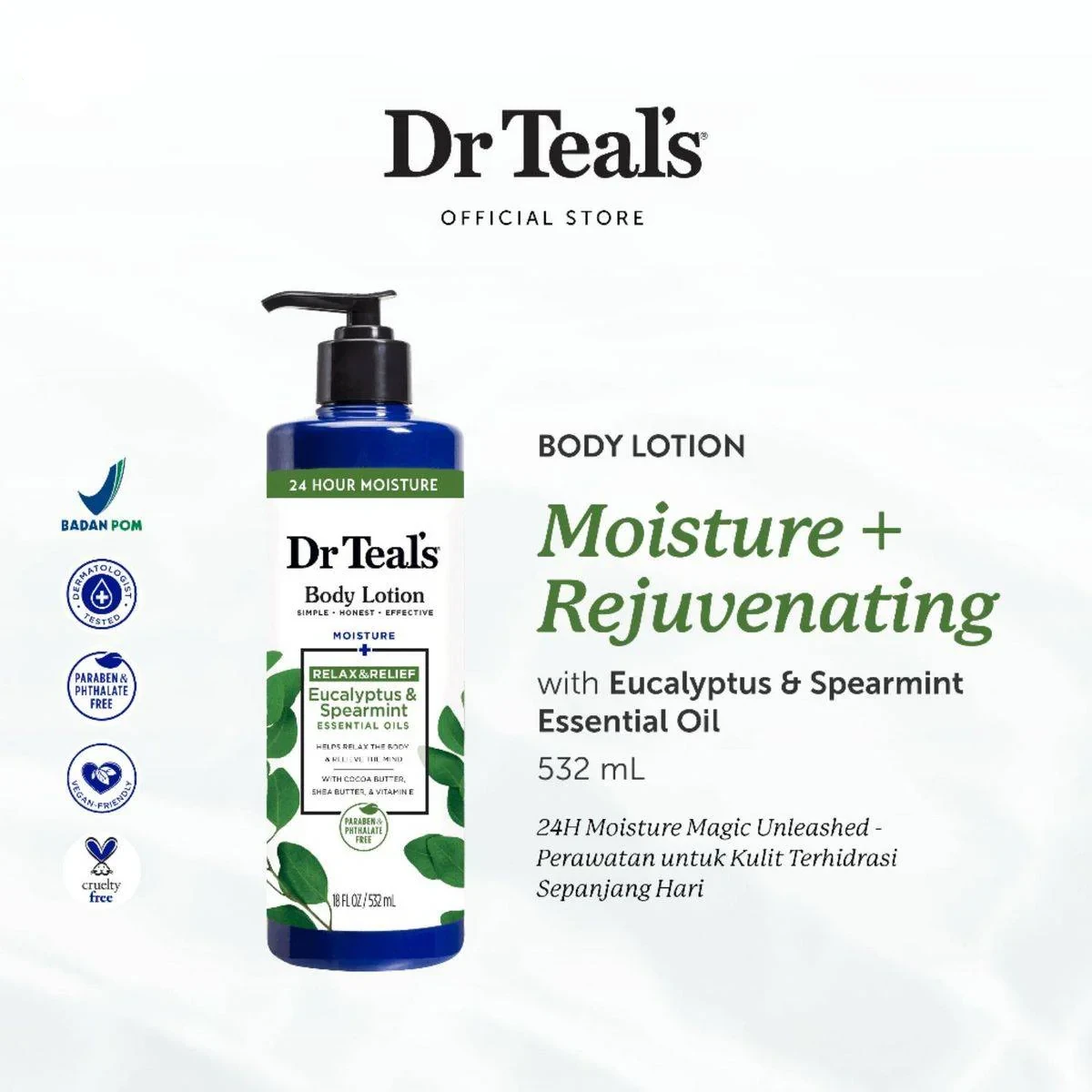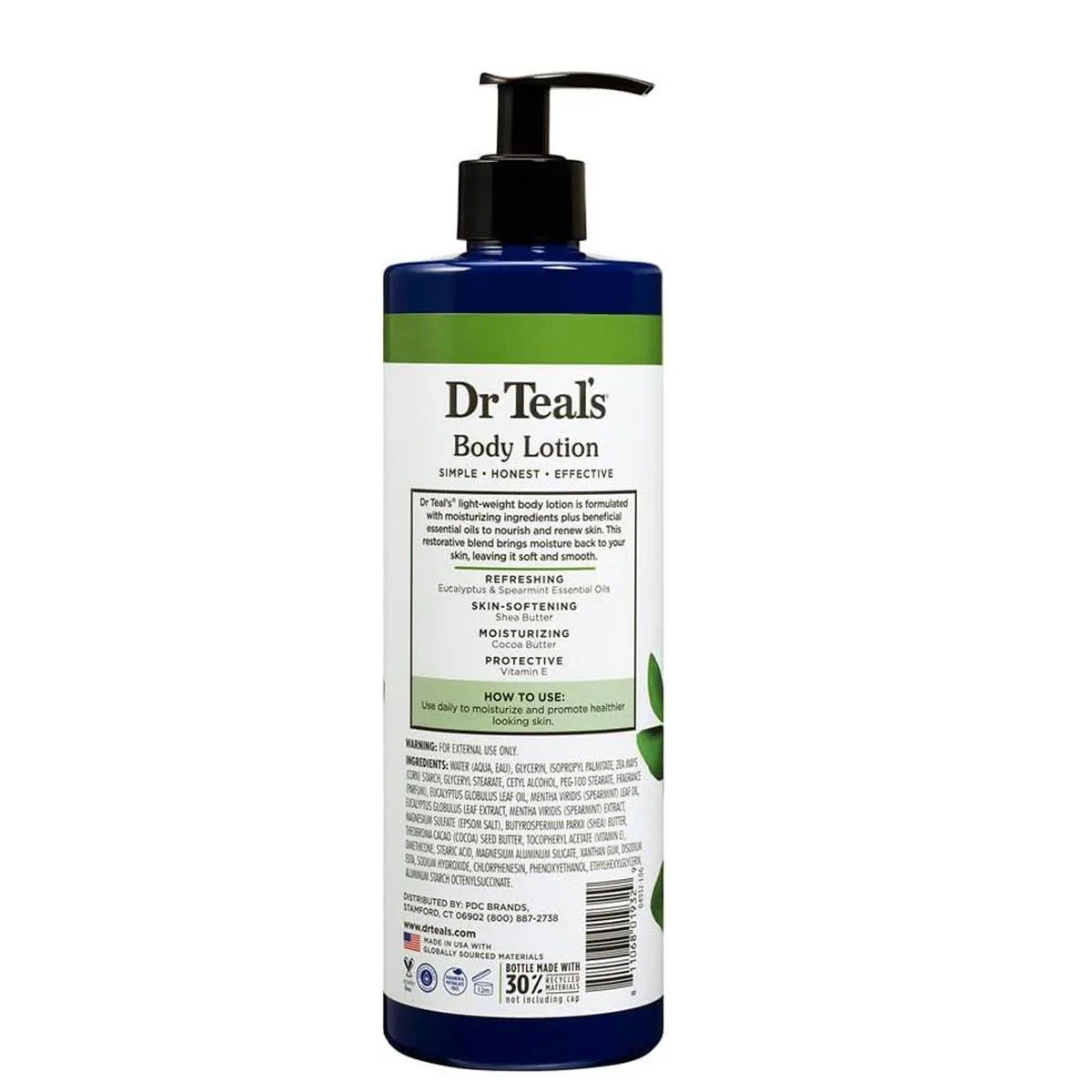 Water (Aqua, Eau), Glycerin, Isopropyl Palmitate, Zea Mays (Corn) Starch, Glyceryl Stearate, Cetyl Alcohol, PEG-100 Stearate, Fragrance, Eucalyptus Globulus Leaf Oil, Mentha Viridis (Spearmint) Leaf Oil, Eucalyptus Globulus Leaf Extract, Mentha Viridis (Spearmint) Extract, Magnesium Sulfate (Epsom Salt), Butyrospermum Parkii (Shea Butter), Theobroma Cacao (Cocoa) Seed Butter, Tocopheryl Acetate (Vitamin E), Sodium Hydroxide, Chlorphenesin, Phenoxyethanol, Ethylhexylglycerin, Stearic Acid, Magnesium Aluminum Silicate, Xanthan Gum, Disodium EDTA, Zea Mays (Corn) Starch Octenylsuccinate.Dr Teal's: Known for effective body care products with essential oils and natural ingredients.Use daily to moisturize and promote healthier looking skin.For external use only.