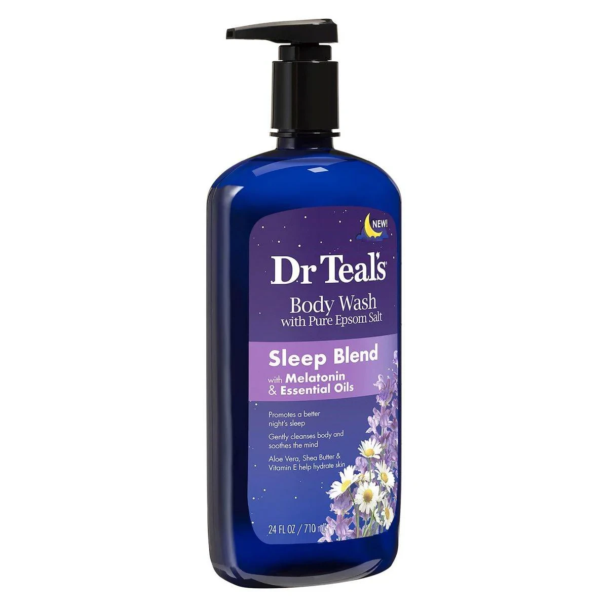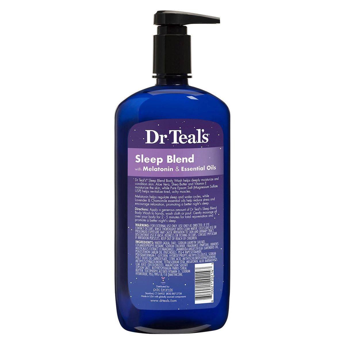 Water (Aqua, Eau), Sodium Laureth Sulfate, Cocamidopropyl Betaine, Sodium Chloride, Fragrance (Parfum), Chamomile Extract, Lavender Oil, Patchouli Oil, PEG-4 Rapeseedamide, Polyquaternium-7, Glycerin, Hydroxypropyl Methylcellulose, Sodium PEG-7 Olive Oil Carboxylate, Citric Acid, Methylchloroisothiazolinone, Methylisothiazolinone, Tetrasodium EDTA, Melatonin, Aloe Vera Leaf Juice, Epsom Salt (Magnesium Sulfate), Shea Butter, Tocopheryl Acetate (Vitamin E), Sodium Hydroxide, PEG/PPG-18/18 Dimethicone.Dr Teal's is renowned for its wellness products, specializing in Epsom salt-based solutions for relaxation and body care.Apply a generous amount to hands, washcloth, or pouf, then gently massage over the entire body for 2-5 minutes to promote a better night's sleep.For external use only. Avoid contact with eyes. In case of irritation, discontinue use. Keep out of reach of children. Not recommended for use during pregnancy or breastfeeding unless after consulting a doctor.