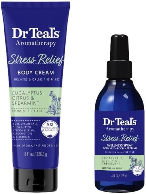 Dr Teal's Aromatherapy Stress Relief Wellness Spray is designed to soothe the mind and relieve tension with a blend of eucalyptus, citrus, and spearmint essential oils. This versatile spray can be used as a body mist, room spray, or on bedding to enhance relaxation. Ideal for daily use, it promotes a stress-free environment and is suitable for all.